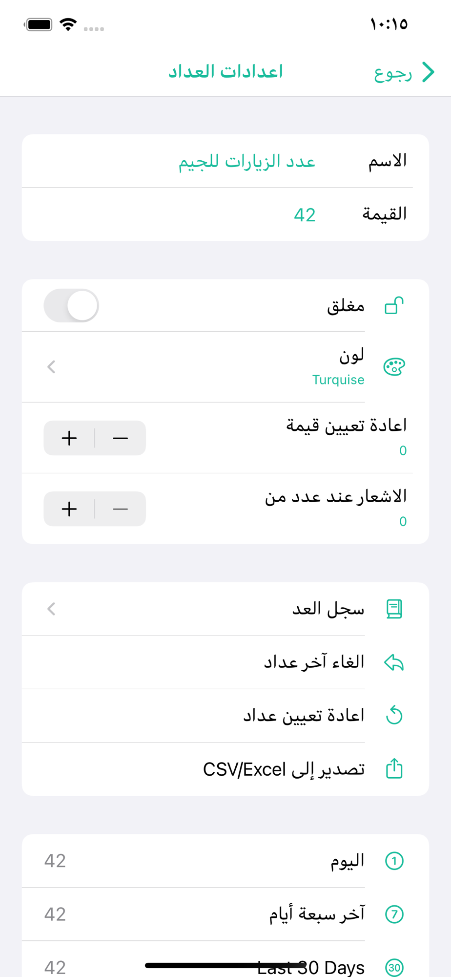 + عرض سجل كل عداد (الوقت المحدد لكل عملية عد) وتصديرها كملف بصيغة CSV