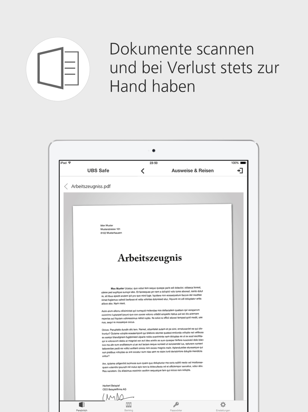 Mit der UBS Safe App können Sie jederzeit und überall auf Ihre Daten zugreifen – auch auf Reisen. Im Falle eines Verlusts oder Diebstahls des Originaldokuments haben Sie stets eine Kopie zur Hand.