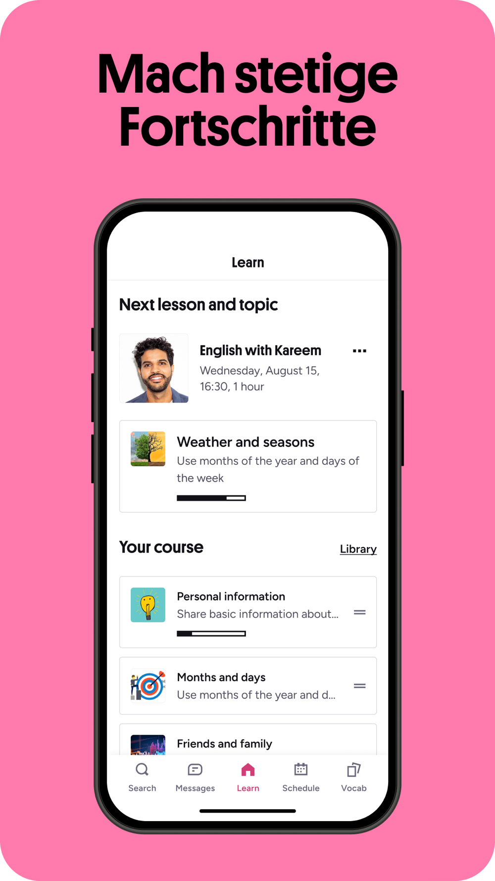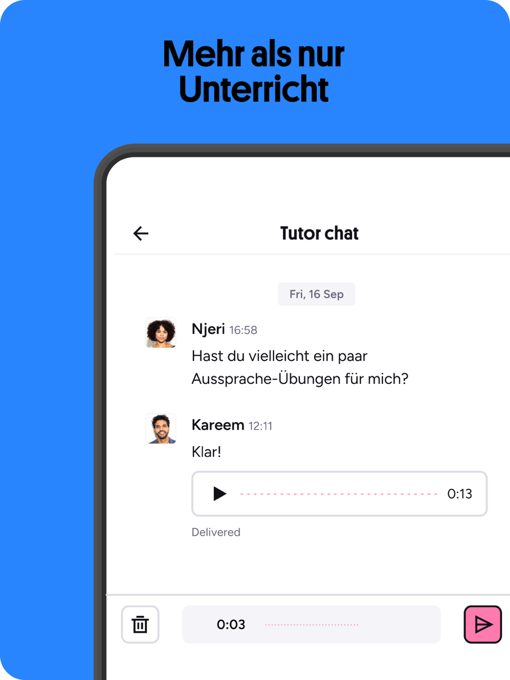 • Lerne die Lehrkräfte in der engeren Auswahl besser kennen, indem du dir ihre kurzen Vorstellungsvideos, die Profilbeschreibungen und Bewertungen anderer Lernender ansiehst. Du kannst deiner Lehrkraft auch über die App eine Nachricht schicken, bevor du die erste Unterrichtsstunde buchst.