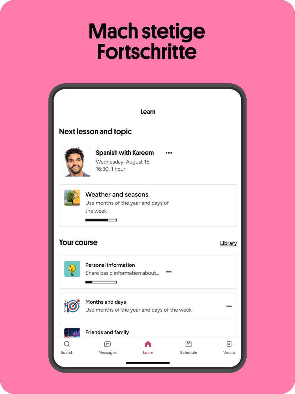 • Wenn du eine passende Lehrkraft gefunden hast, ist es Zeit, eine Probestunde zu buchen und mit dem Lernen zu beginnen. Wir empfehlen, den Einstufungstest zu machen, um dein Sprachniveau festzustellen und deinem neuen Lehrer oder deiner Lehrerin eine kurze Nachricht mit deinen Vorkenntnissen und Lernzielen zu schicken.