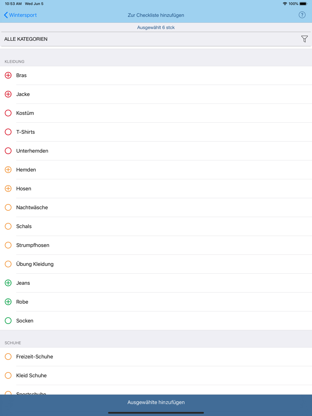 Genießen Sie allgemeine Checklisten mit ca. 200 Artikeln. Verwenden oder entfernen Sie dann beliebige Sachen. Gestalten Sie Ihre Reisecheckliste individuell, indem Sie Ihre eigenen Listen, Kategorien und neuen Dinge hinzufügen. Sortieren und bearbeiten Sie nach Ihrem eigenen Geschmack. Alternativ können Sie auch die Menge für Artikel Ihrer Wahl hinzufügen (z.B. Anzahl der Hemden, Jeans, Schuhe).