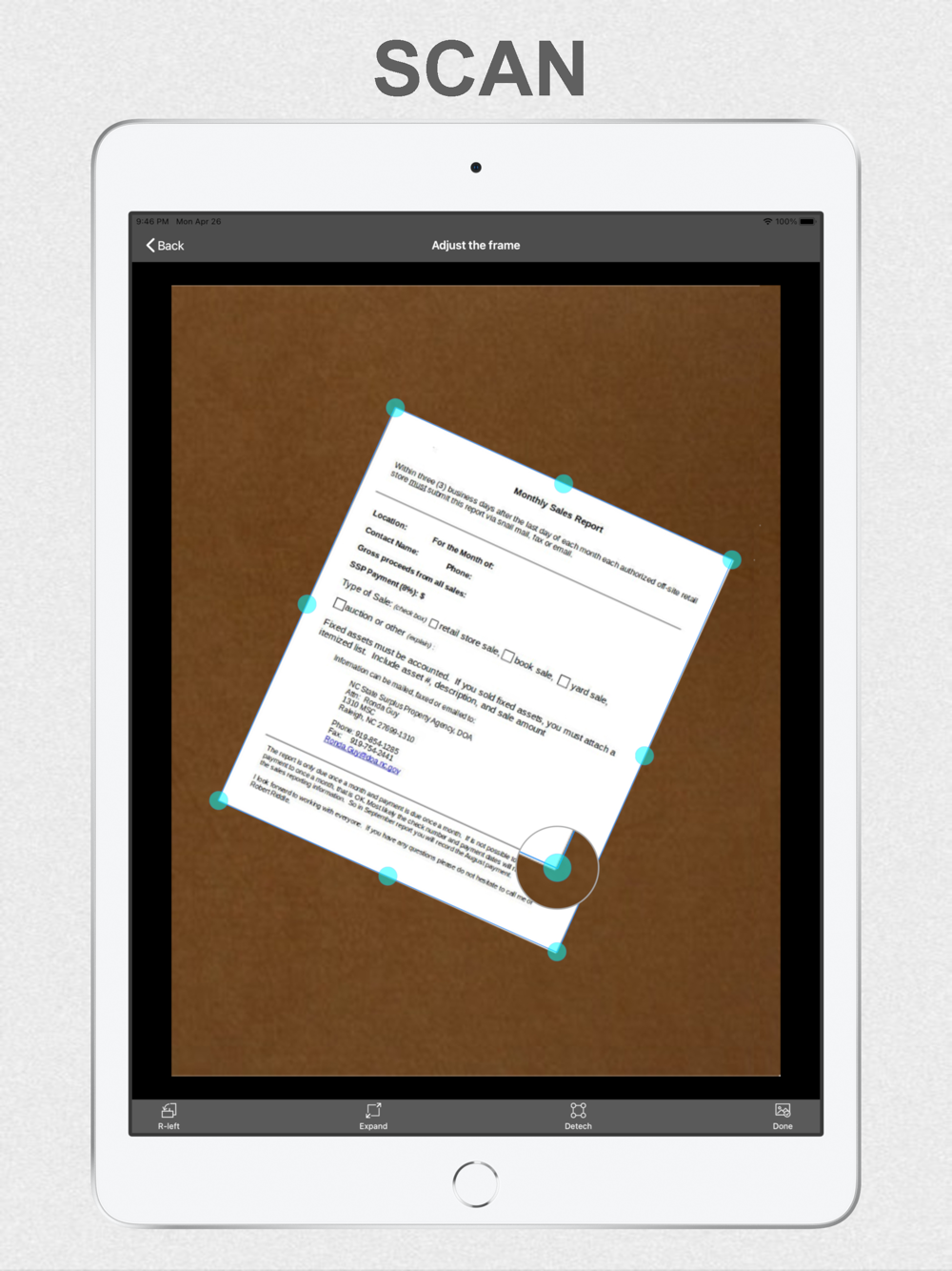 Scanner app free turn your iPhone & iPad devices into powerful, portable scanner in your pocket. Download this Scanner app free to scan all kind of your documents: bill, receipts, notes, contract, ID card, driver license, passport, book or paperwork within a second to high quality PDF, JPEG files to share, email, AirPrint, upload to clouds at anytime, anywhere.
