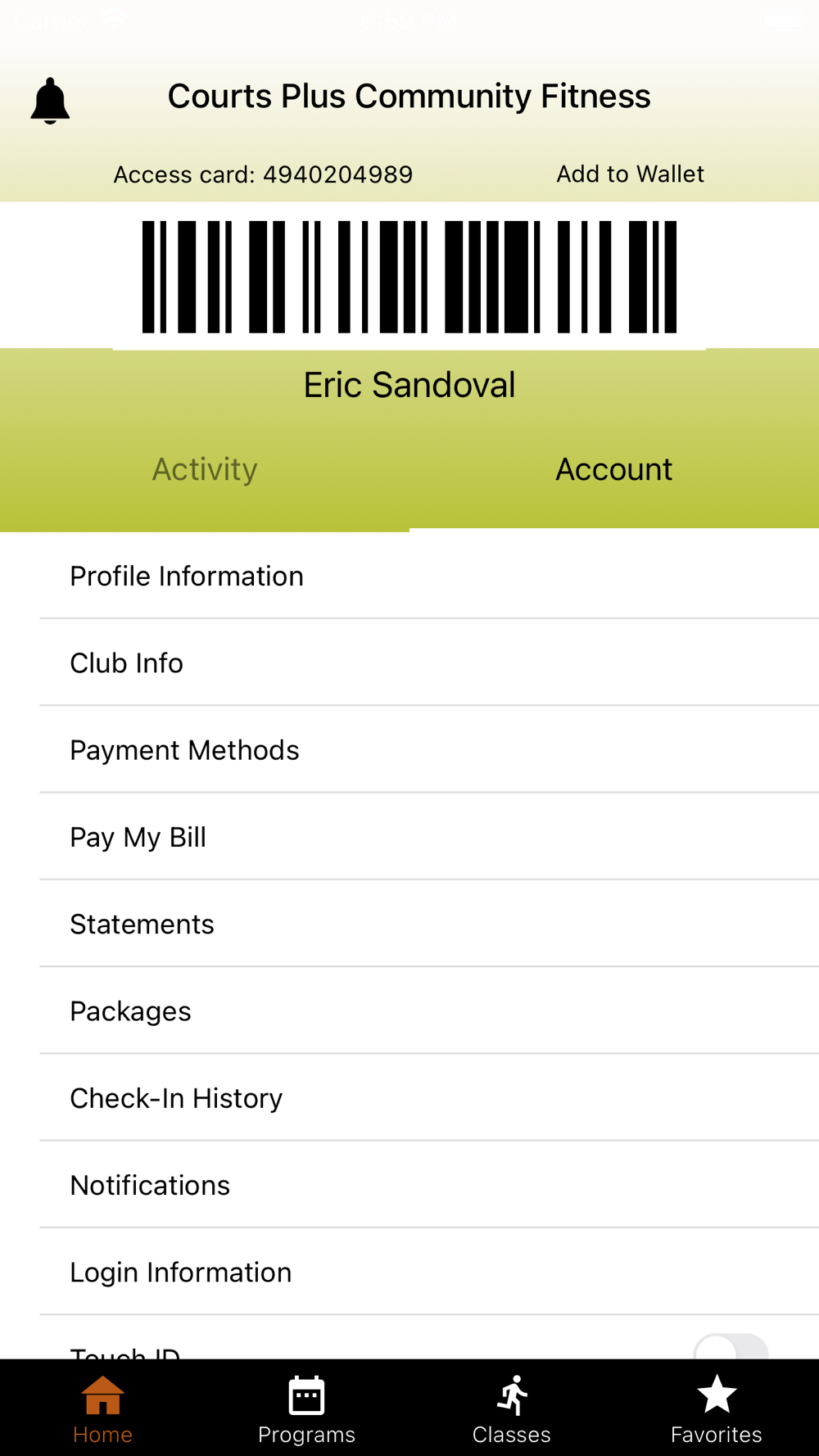 - Members can view their account information such as; profile information, check-in history, statements, packages, and login information.