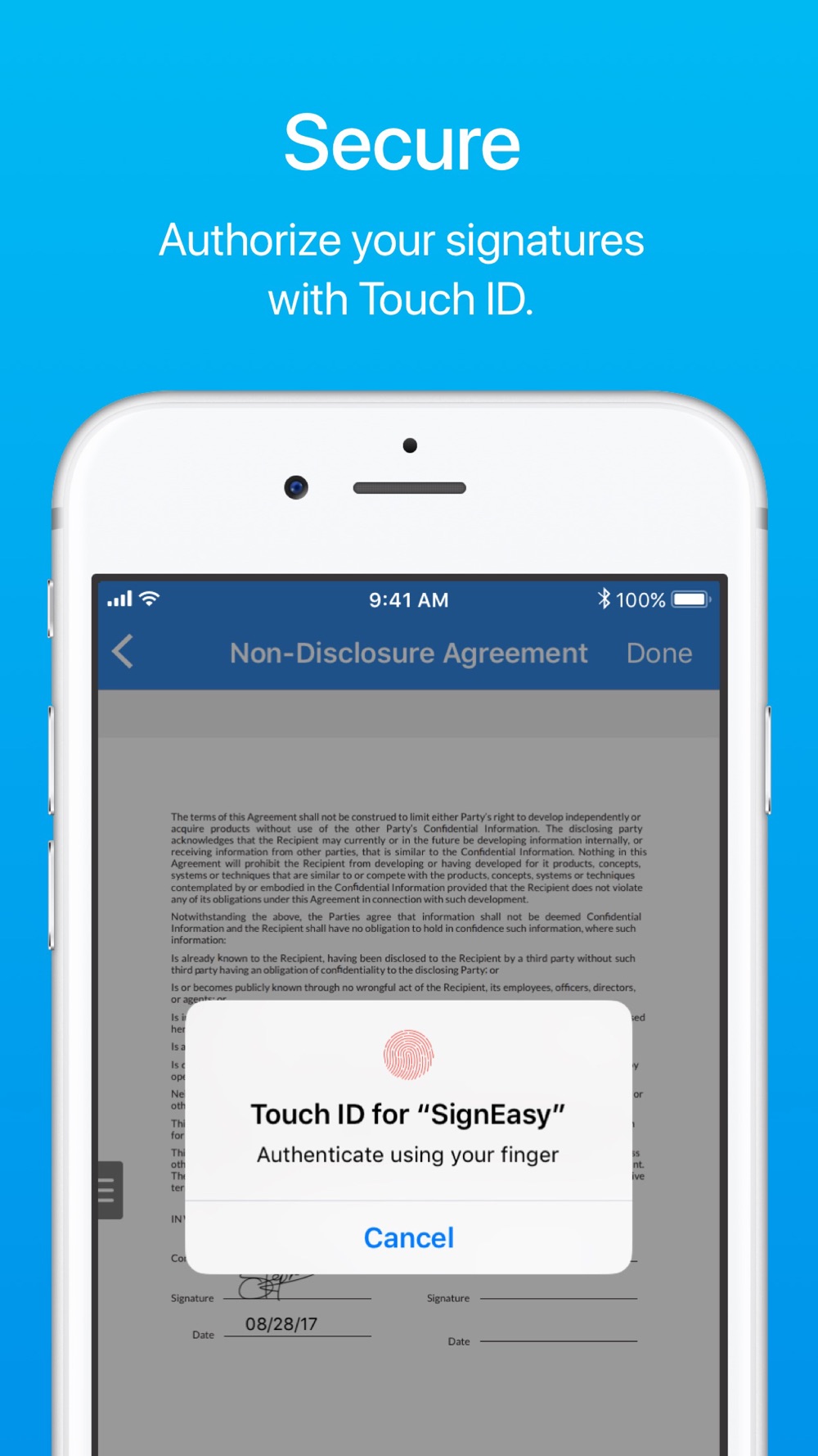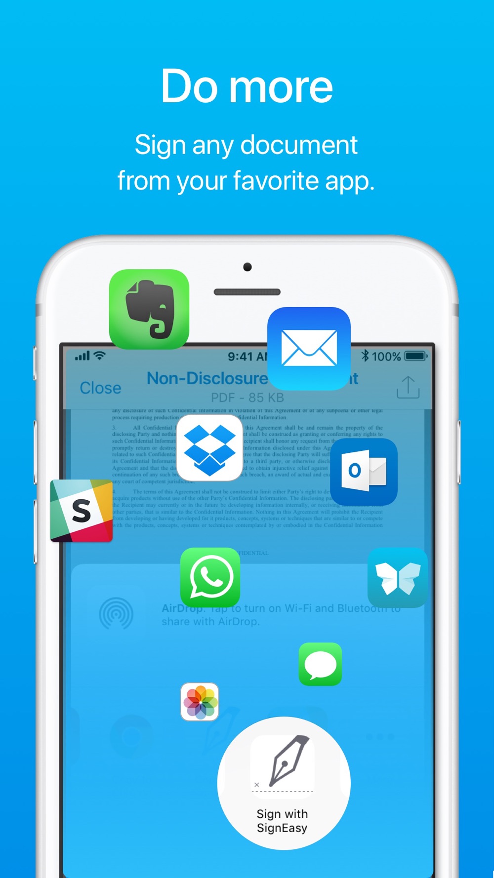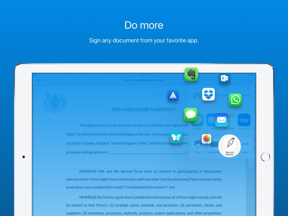 SignEasy is the easiest way to sign any document on your iPhone and iPad, and as legally binding as using a pen. Downloaded over 6 million times.