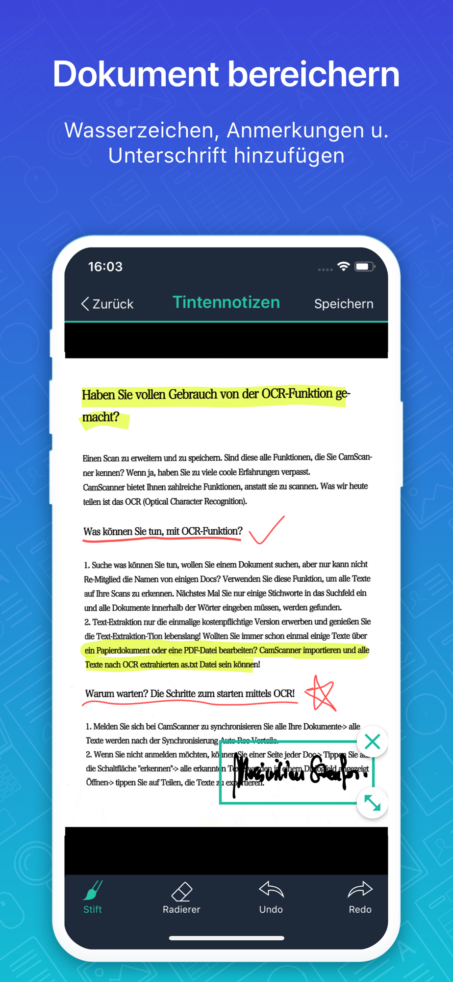 Man kann handschriftliche Notizen in seine Dokumente machen oder Ihre eigene Wasserzeichen erstellen und einfügen.