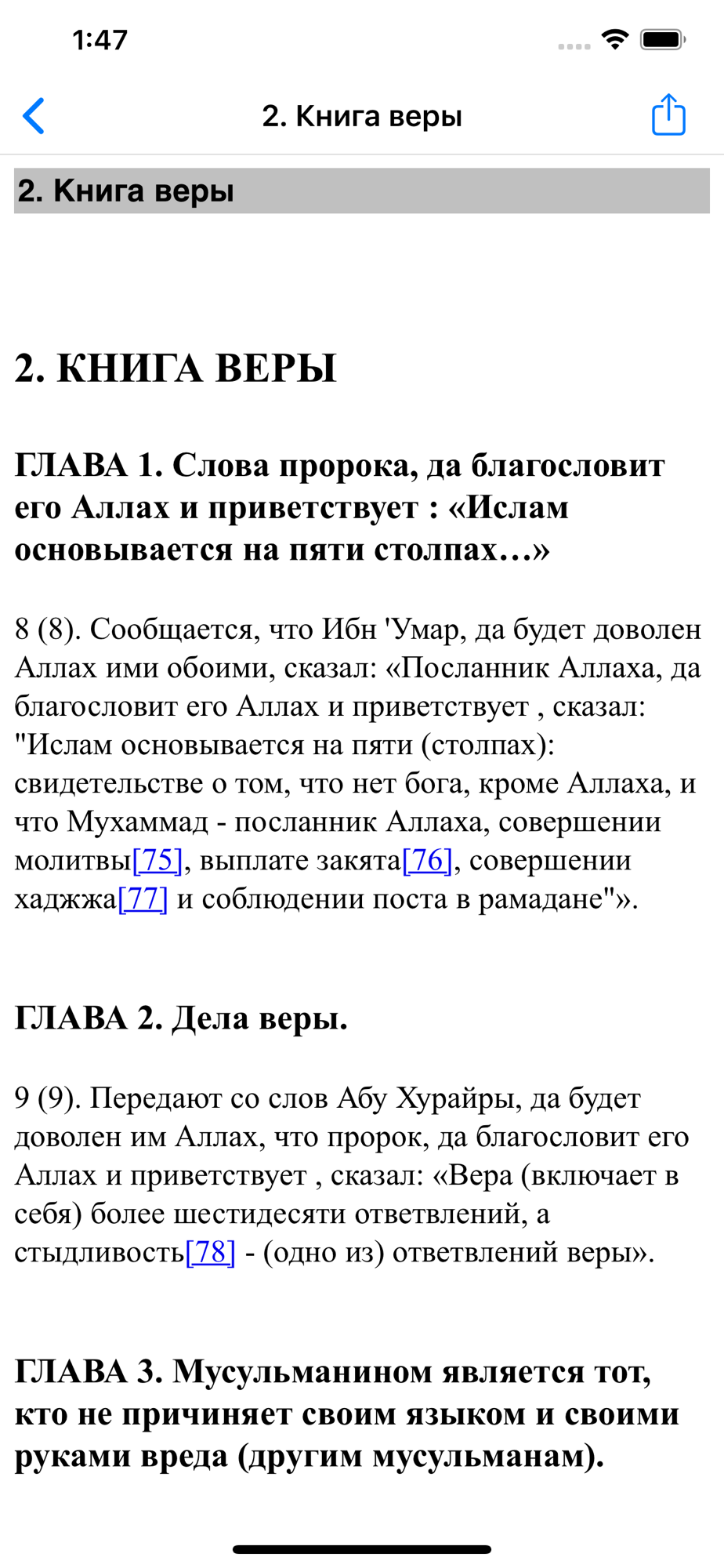 2. Закладки - сохранение последнего читаемого раздела и прогресса чтения каждого раздела в отдельности.