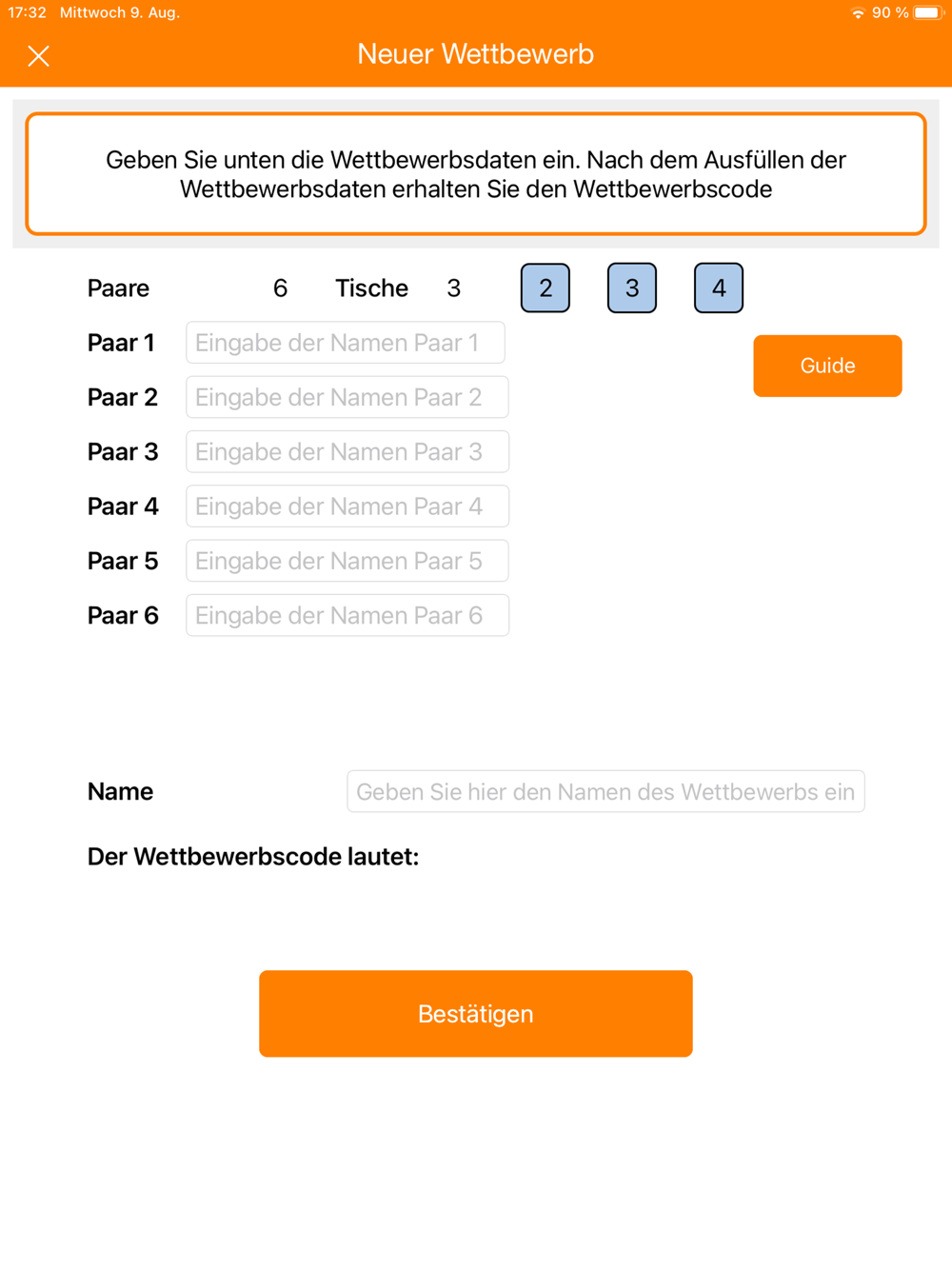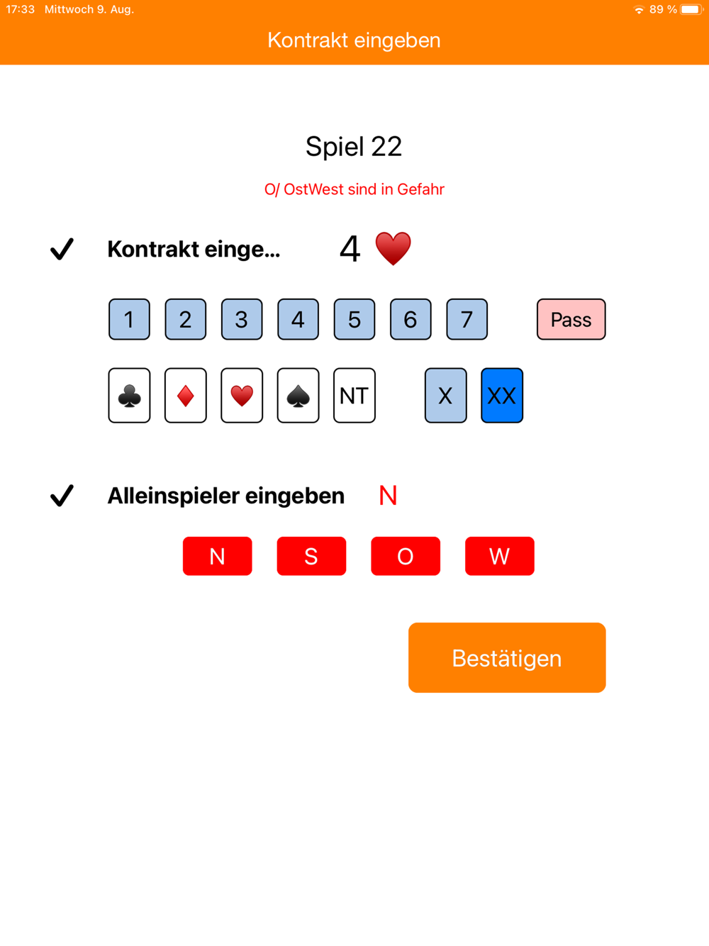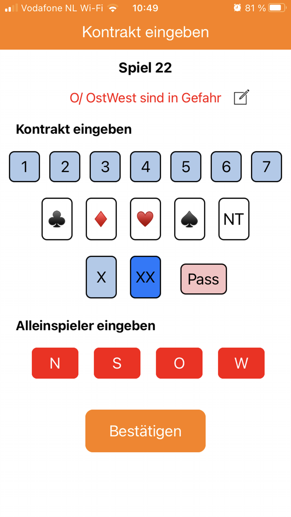 Nach dem Bieten können die Verträge eingegeben und nach dem Spielen die Punktzahlen erfasst werden. Die App bietet dir einen Überblick über den Spielplan für die verschiedenen Paare und Tische.