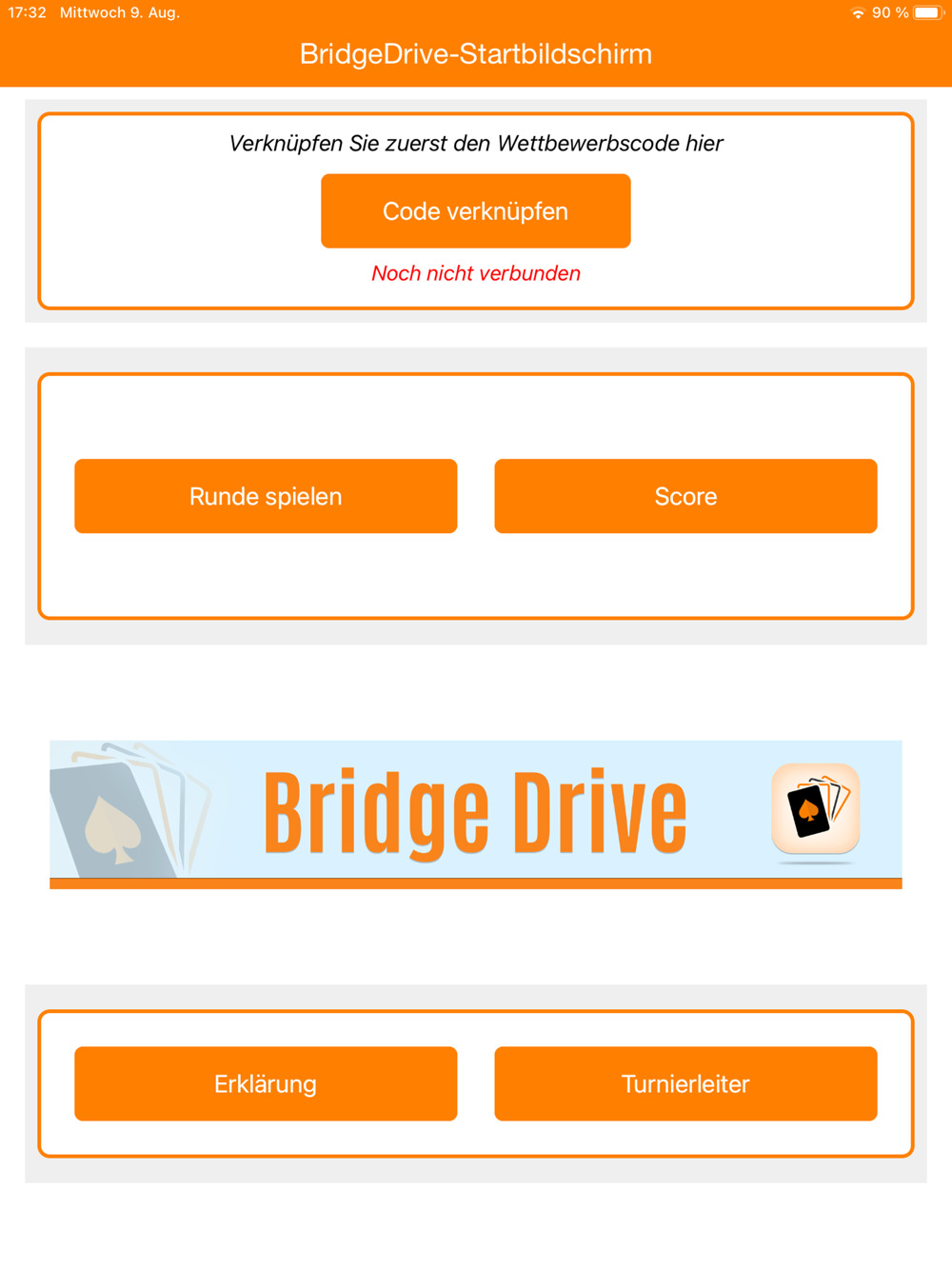 Mit BridgeDrive kannst du Bridge-Turniere mit 2, 3 oder 4 Tischen organisieren, was 4, 6 oder 8 Paaren entspricht. Verschiedene Tablets oder Smartphones können über einen vom Turnierleiter generierten Code verbunden werden.
