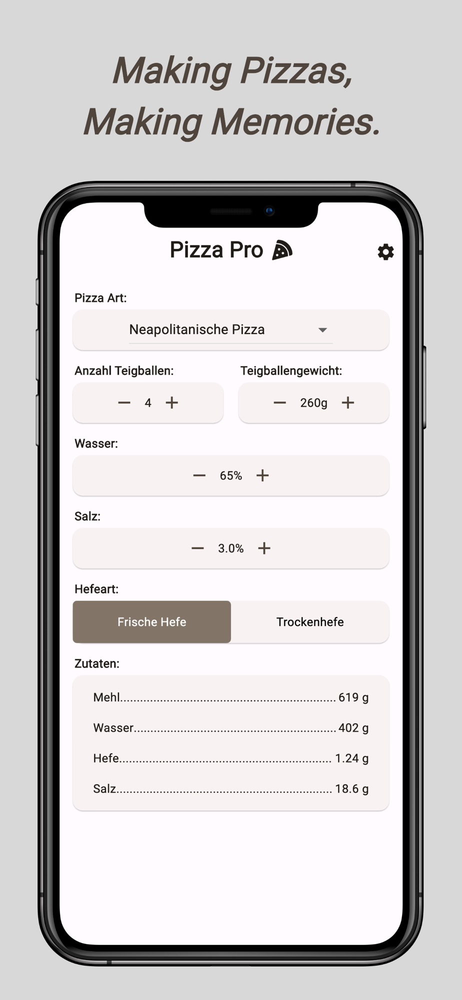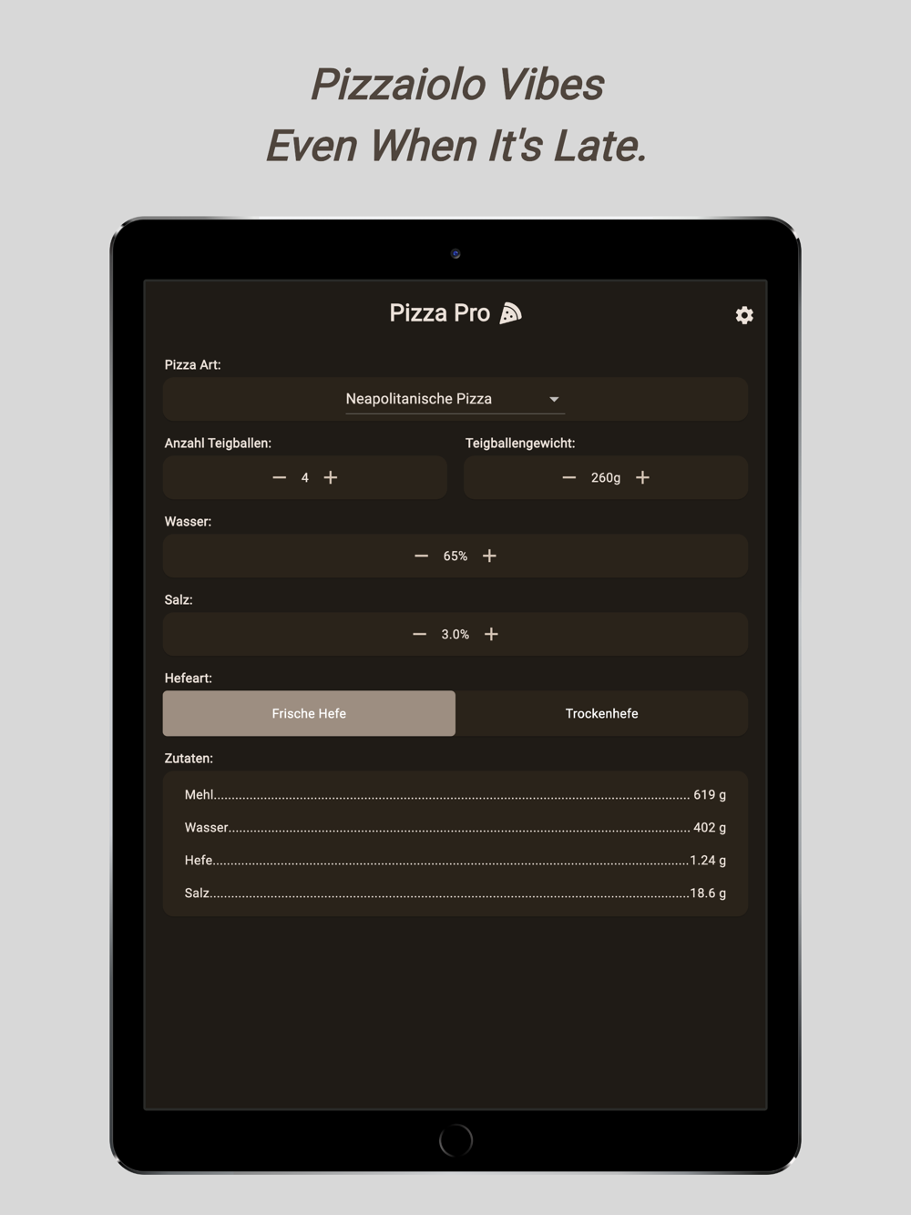 Herzlich willkommen bei deiner ultimativen Pizzateig-App! Erschaffe den idealen Teig für deine einzigartigen Pizzen, ohne Kompromisse. Ob knusprig dünn oder luftig-fluffig – diese App gibt dir die Kontrolle über jeden Teigaspekt.