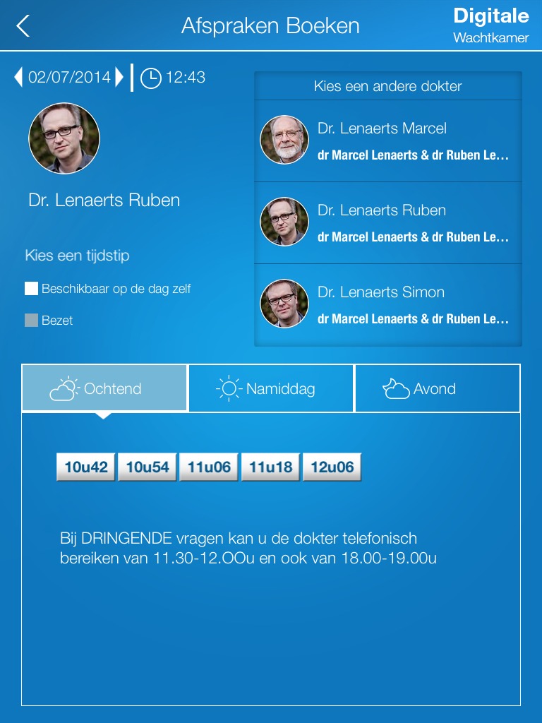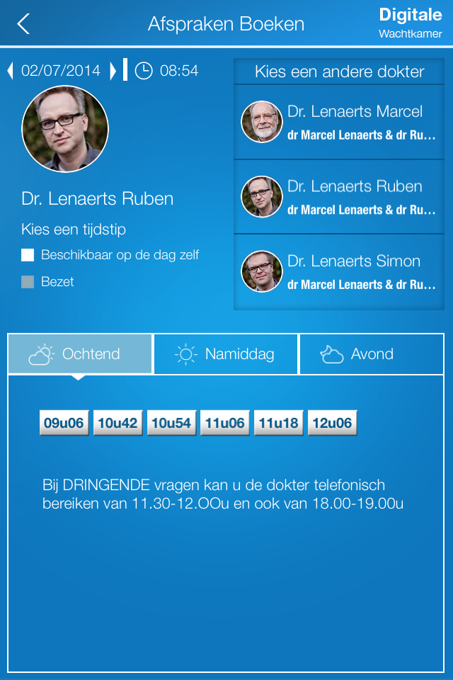 Patiënten kunnen met behulp van deze app een afspraak vastleggen bij zijn huisarts en deze afspraken beheren. Indien toegestaan kan men ook een huisbezoek aanvragen of de achterstand van de consultaties bij een dokter achterhalen.