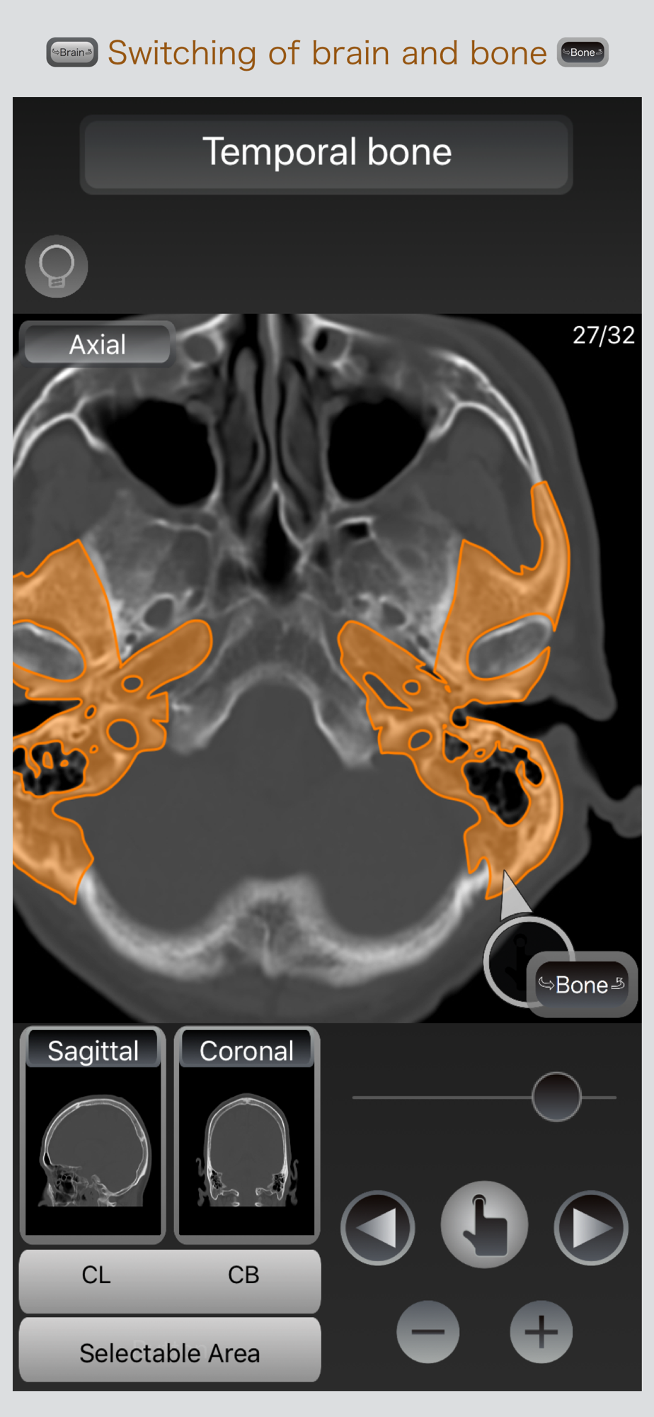 In this app, and displays the anatomy name at the touch of a image, not only examined a portion of interest immediately, it is capable of switching display of the axis position cross-sectional, and coronal cross-sectional, and sagittal cross-section, of a selected site you can grasp the positional relationship instantly.