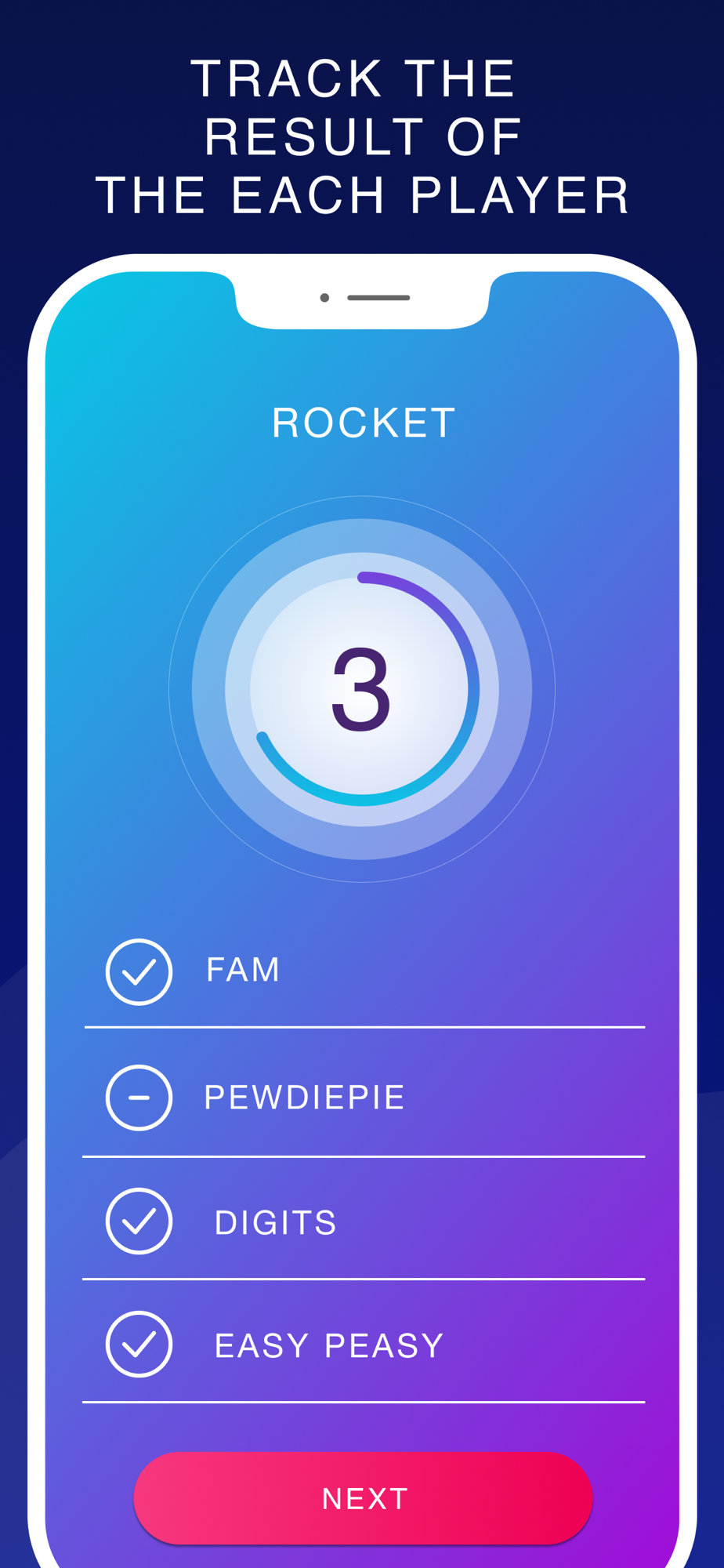 You can add new players. Last result, total score and games are shown for each player. Click on a player's name to change it – from 1 to 14 symbols.
