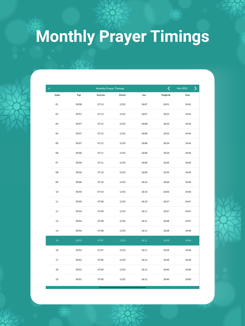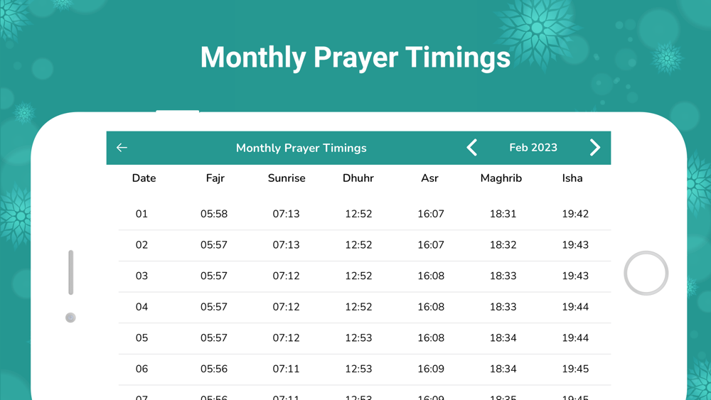 - Monthly Prayer Times shows the entire month’s prayer times in the app.