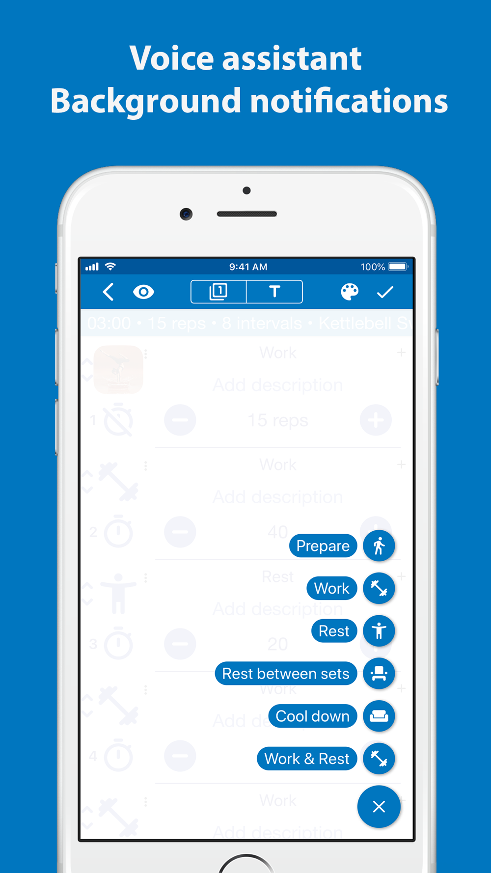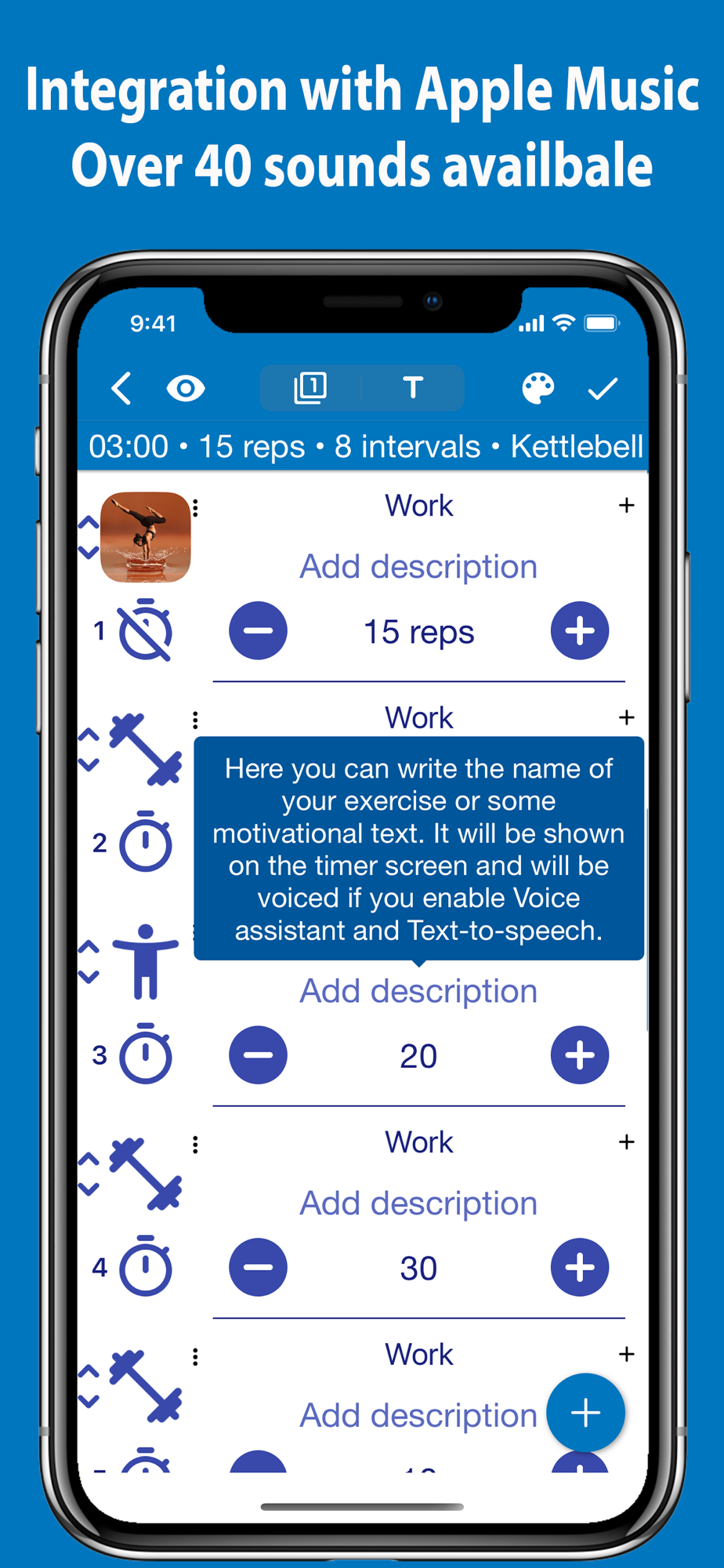 • Add descriptions to intervals that will be displayed on the timer screen and will be voiced.