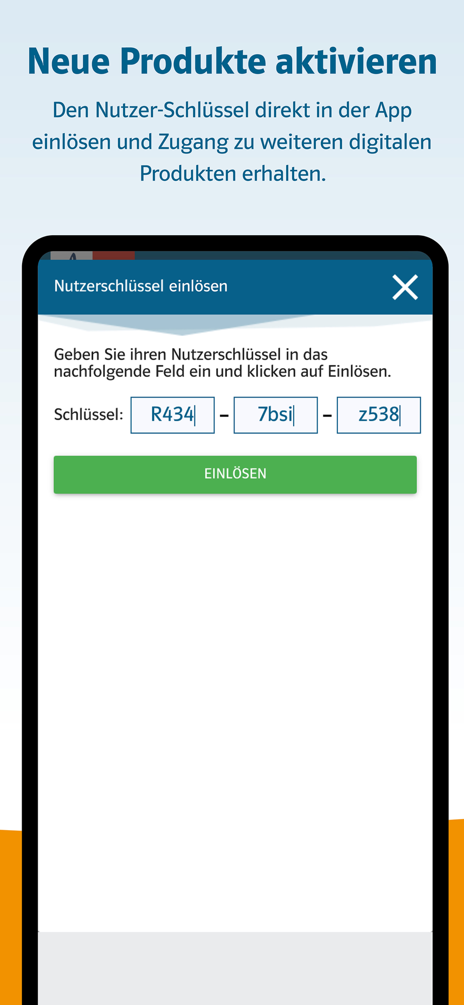 • Aktivierung neuer Produkte durch Eintippen des Nutzer-Schlüssels