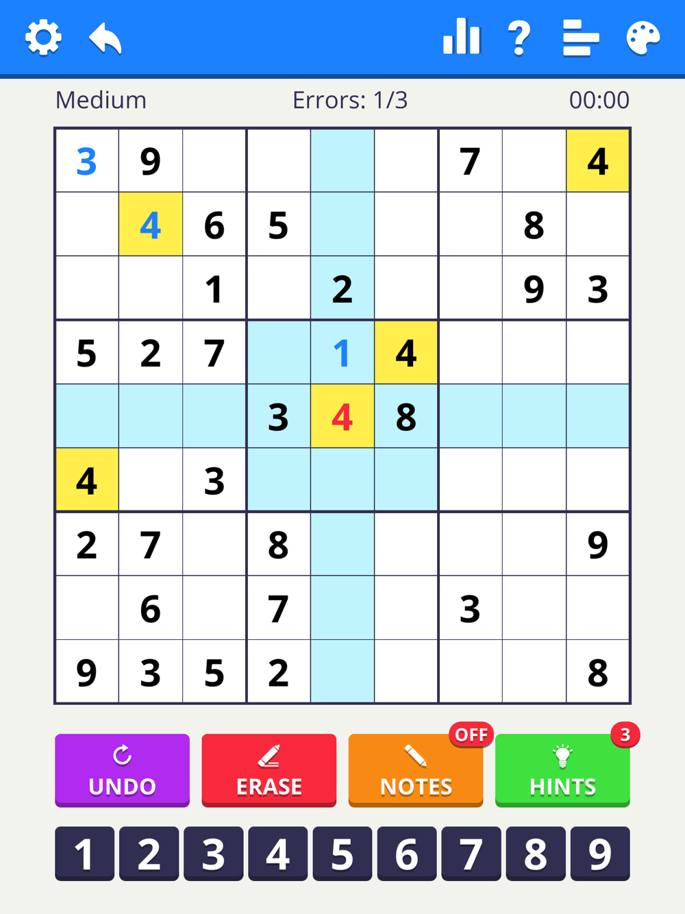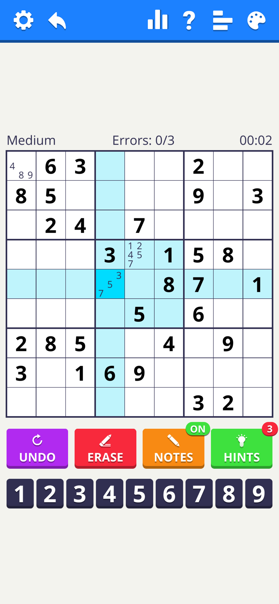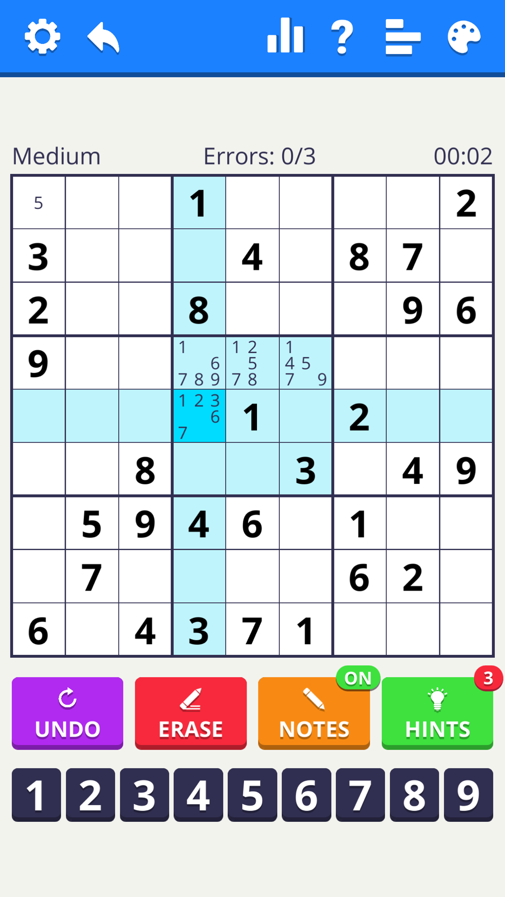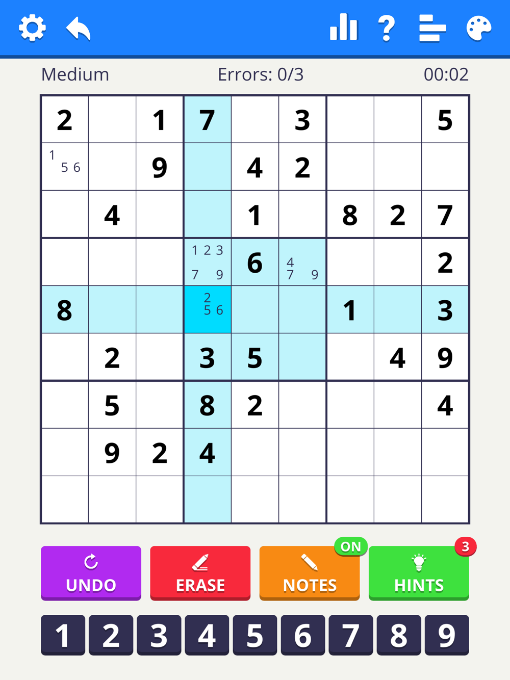 - Turn on Notes to make notes as on paper. Each time you fill in a cell, notes are automatically updated!