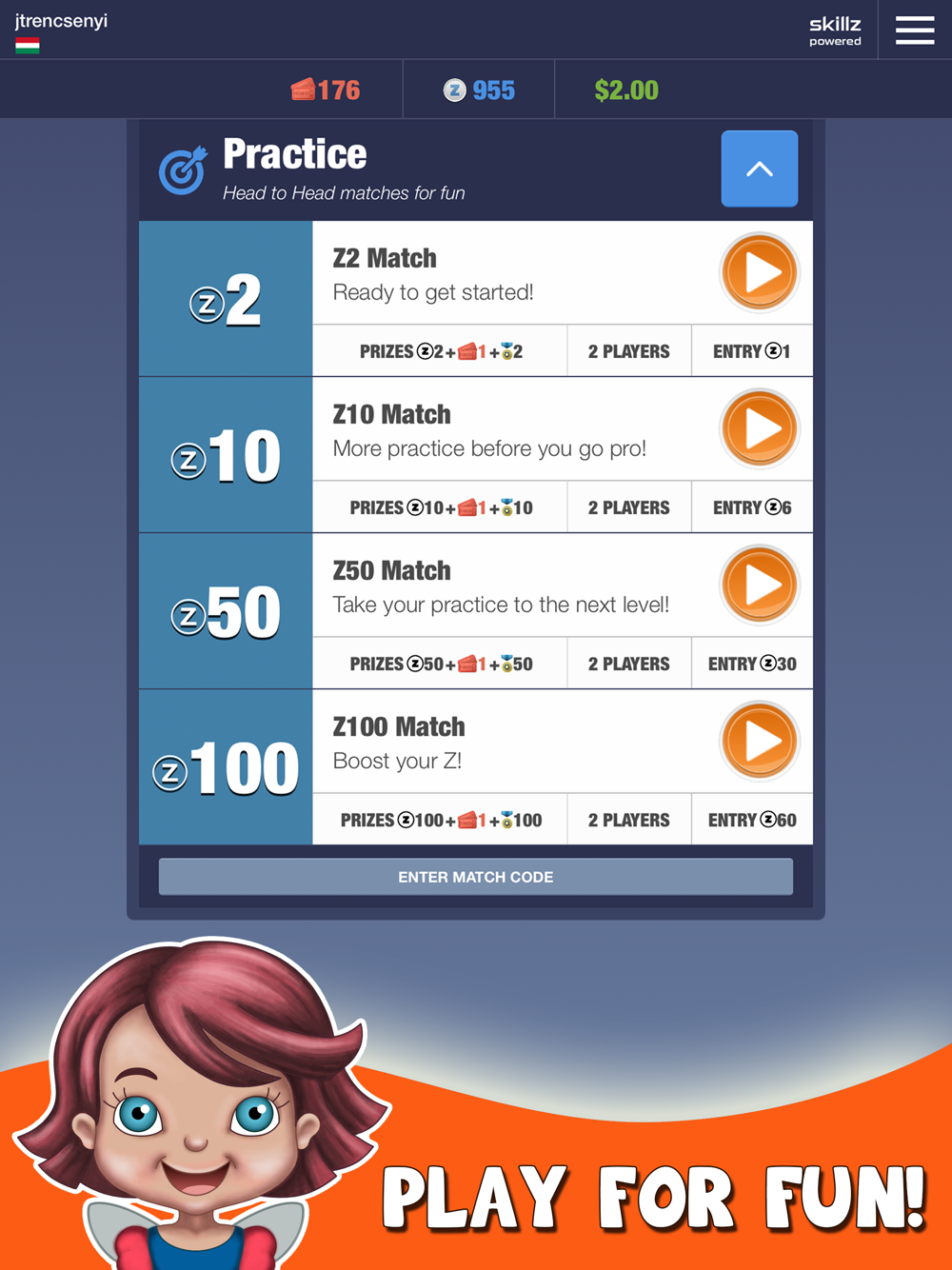If you have any questions about the Skillz system or real world prize tournaments please contact: support@skillz.com