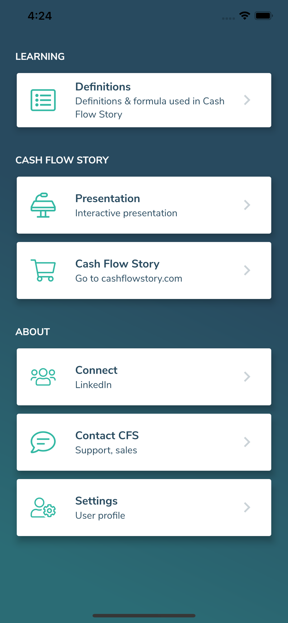 The Cash Flow Story mobile app is a pocket guide containing access to various educational materials such as formulas and definitions used in the online software.