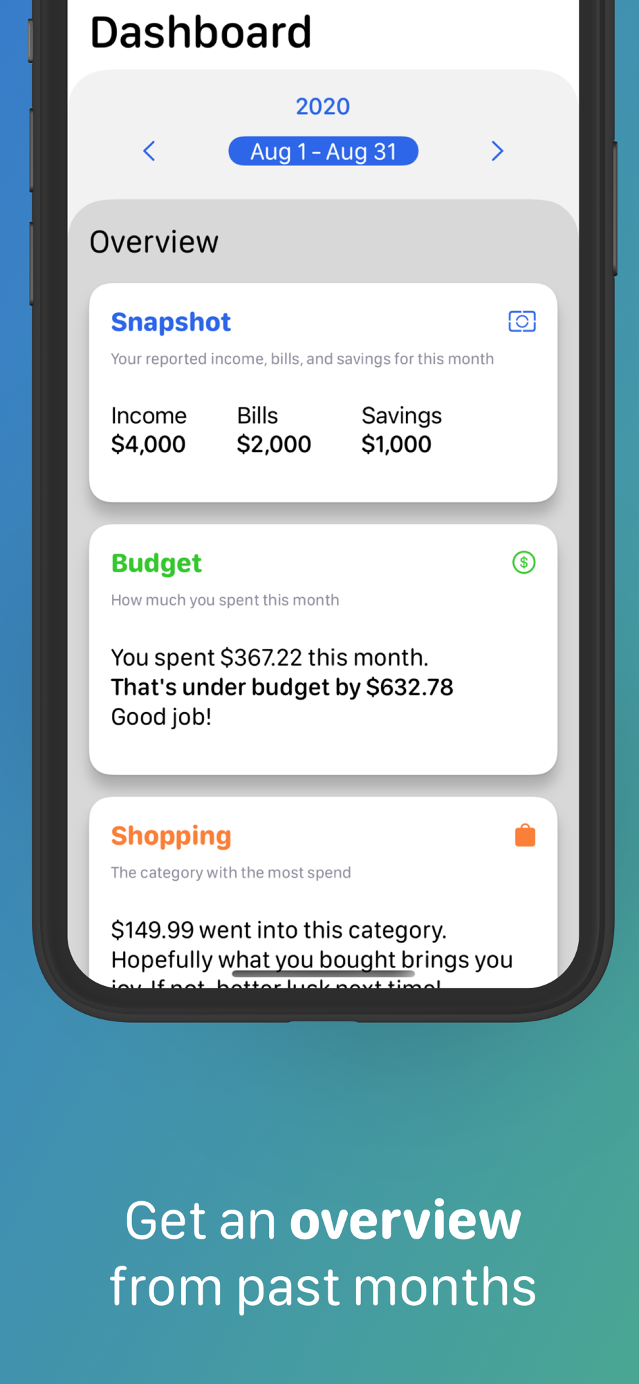 Our relationship with our finances changes over time. Understanding the entirety of your financial picture can be very helpful for you to realize your personal goals. You can navigate to past months straight from the dashboard, by tapping the back/forward buttons. If you want to see a completely different year, just select a new one by tapping the year button right above your month display.