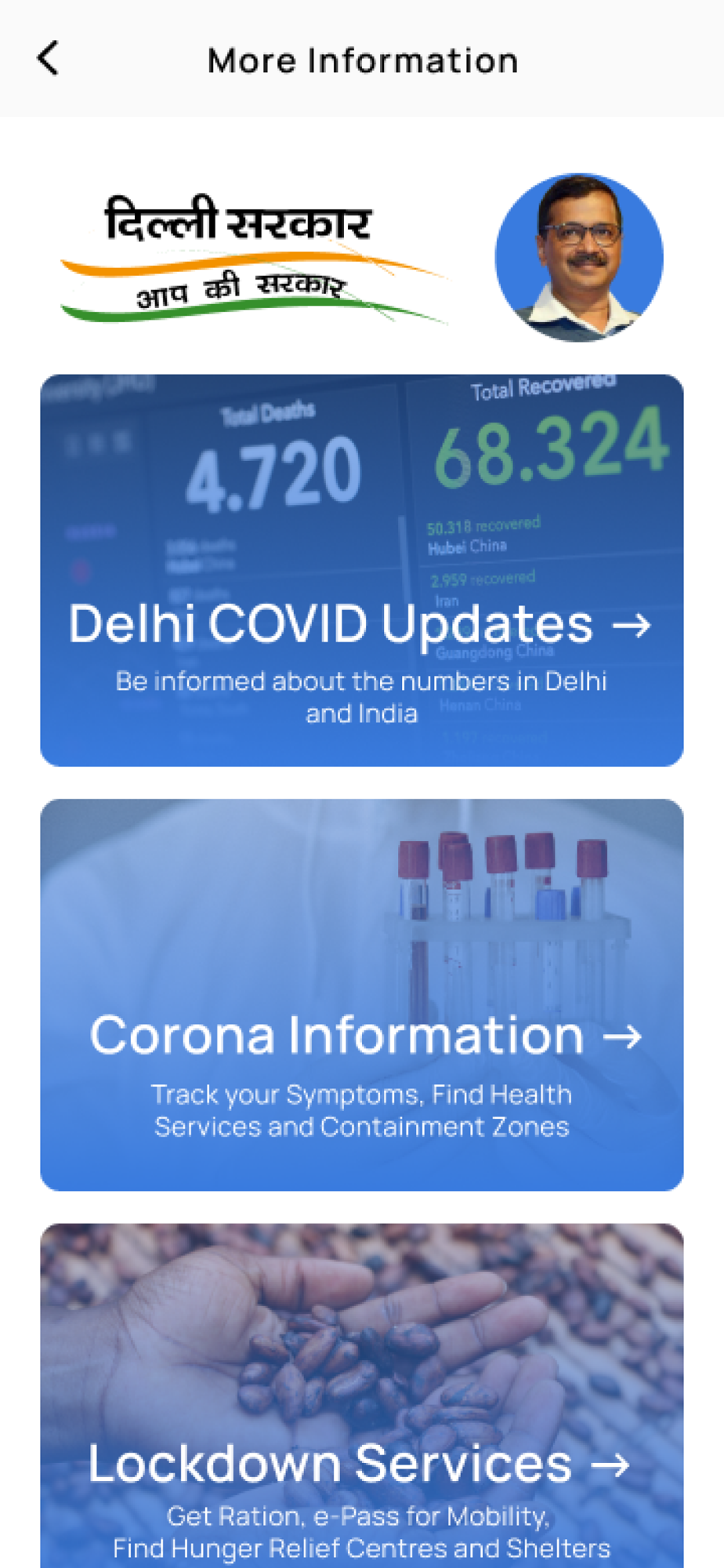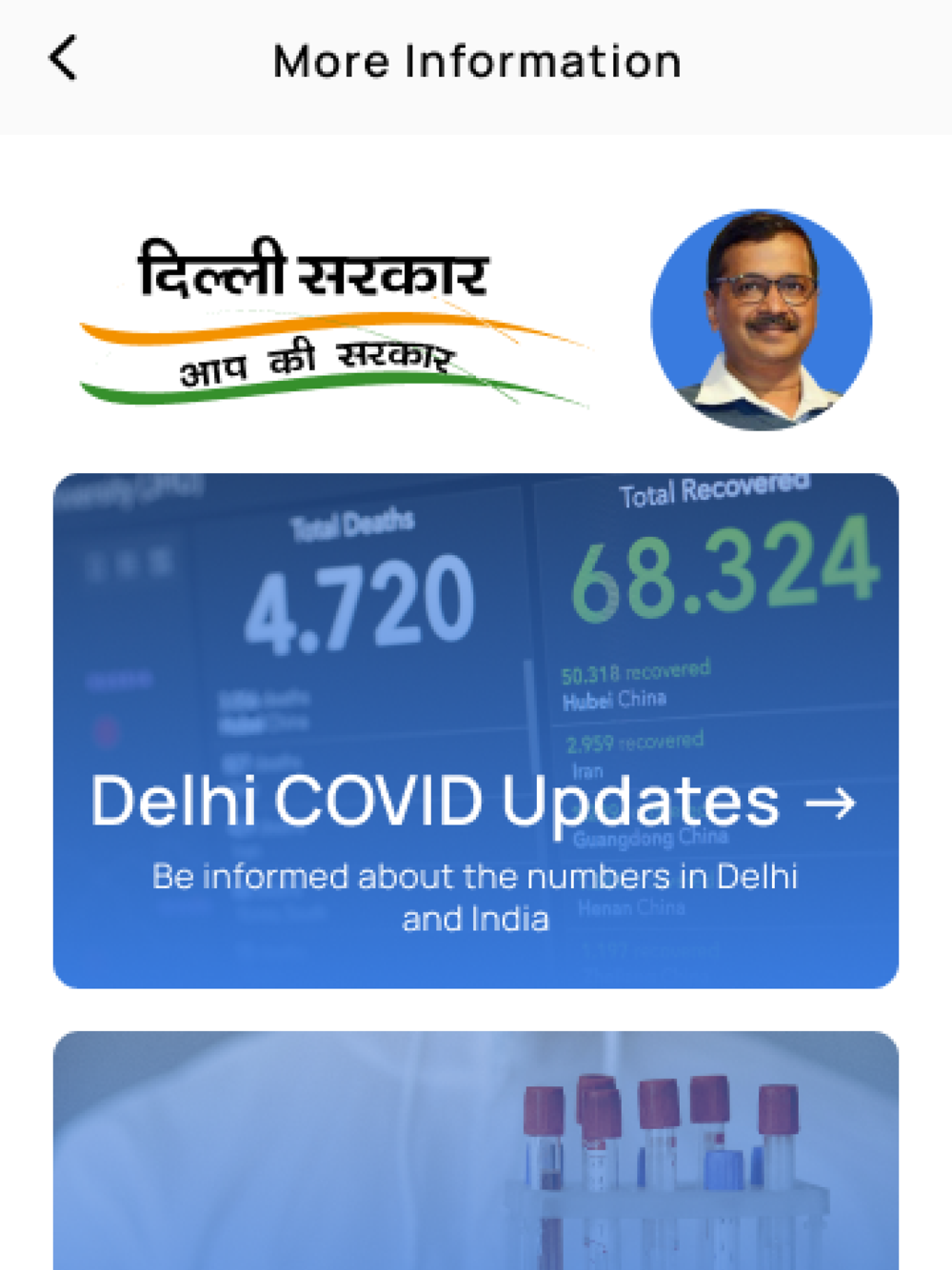 Delhi Corona is the official mobile application of the Government of NCT of Delhi providing citizens with comprehensive resources to combat COVID using services of the line departments of GNCTD.