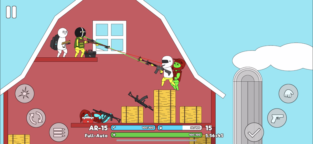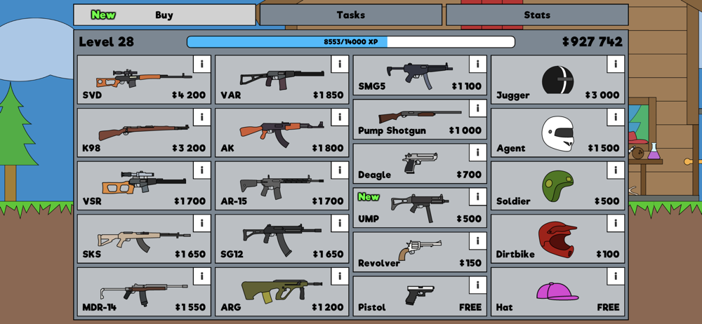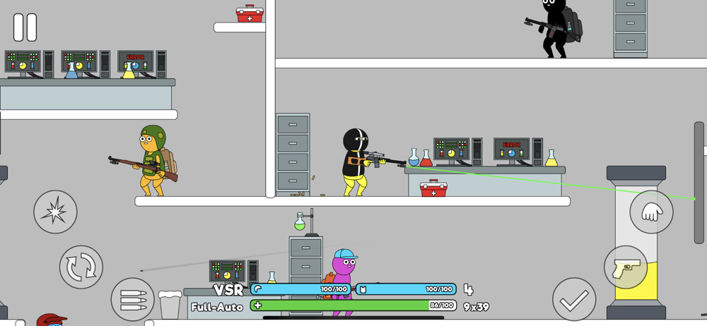 Raid Rush is an action-packed platform shooter. Unlock new guns and armor and go up against tough enemies on several different maps. Eliminate enemies and complete tasks to level up and access better gear.
