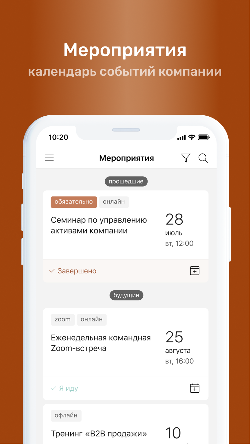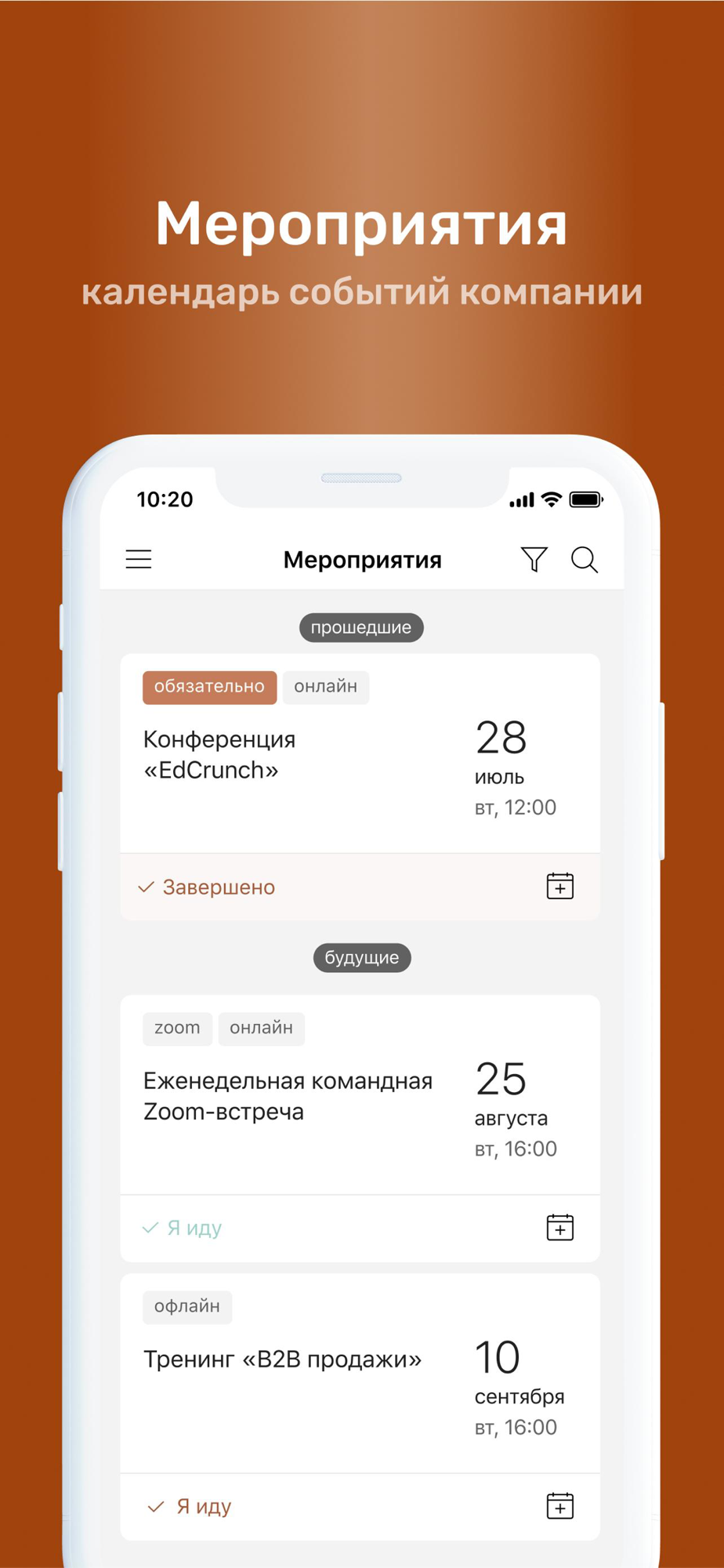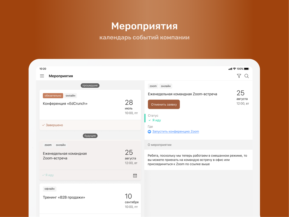 ⁃ Календарь корпоративных мероприятий с возможностью подать заявку на участие