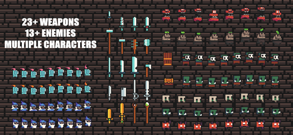 Each theme has specific monsters, pixelated dungeons and obstacles like bombs, traps...
