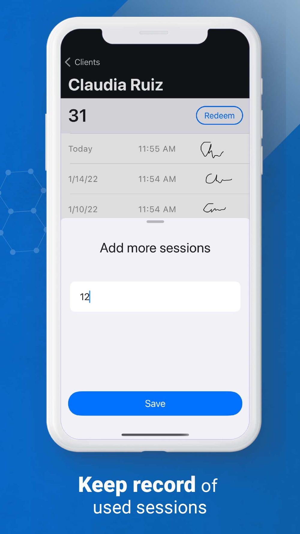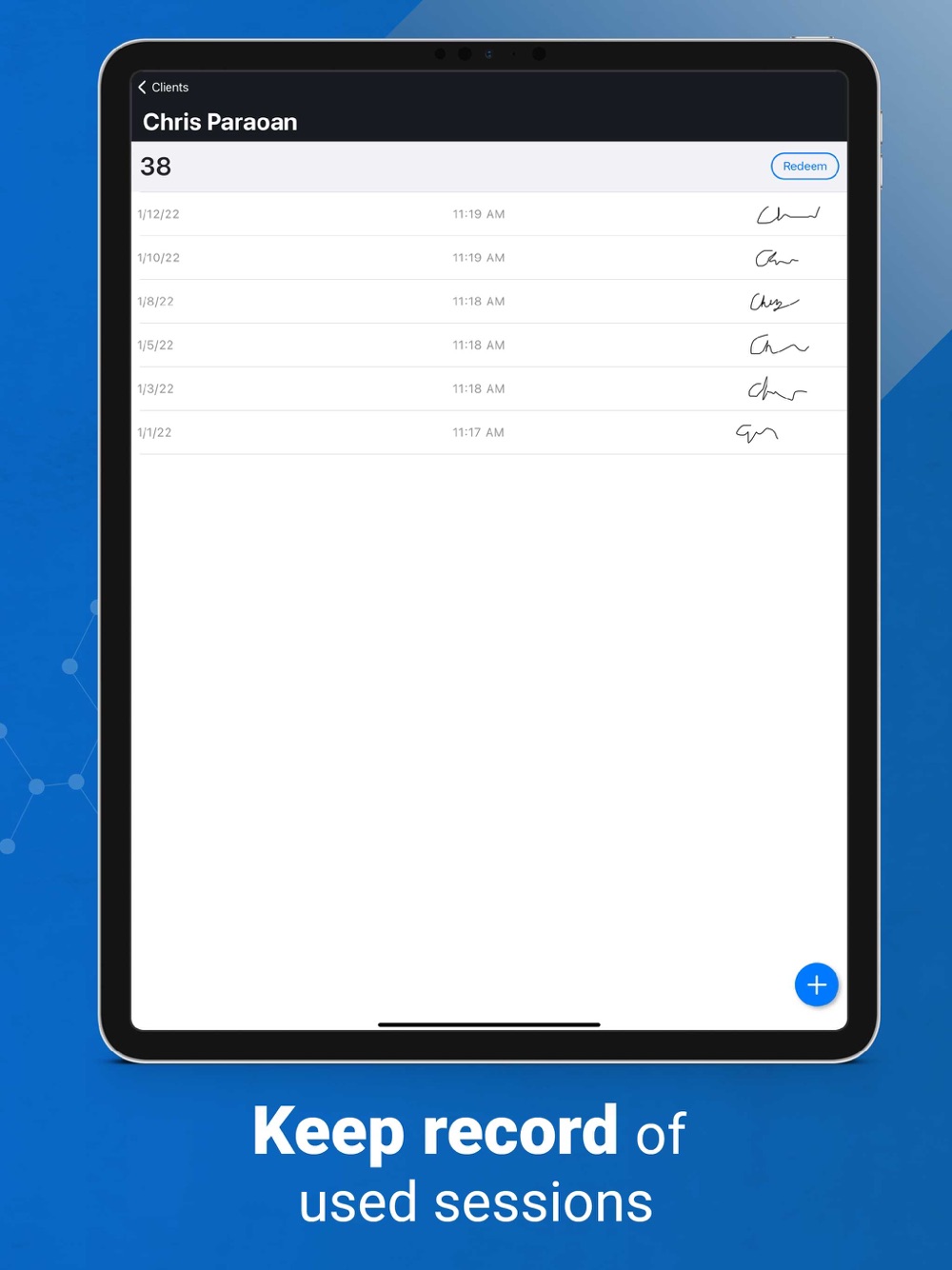 PT Sessions is a simple app for keeping track of your client's sessions. Use the signature pad to sign out your clients for each session used. PT Sessions can be used for anything where you need to keep track of your clients sessions whether it be personal training, massage therapy or guitar lessons.