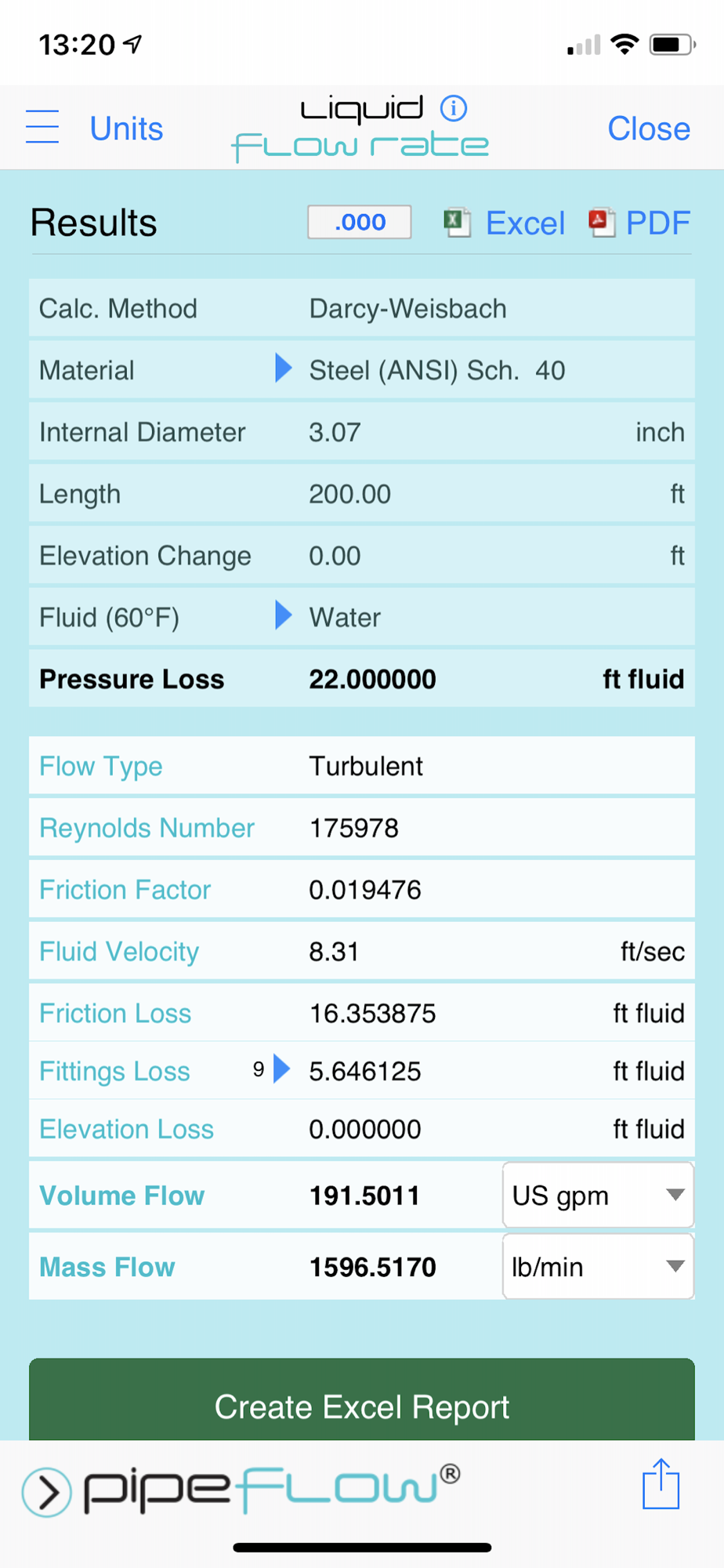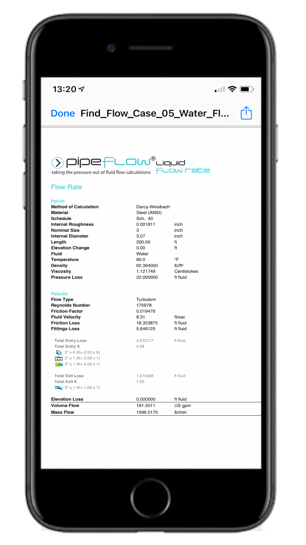 Engineers can easily perform their flow rate calculations in the office or on site. Professional Excel and PDF reports can easily be shared with others. Results can also be saved to the library within the App.