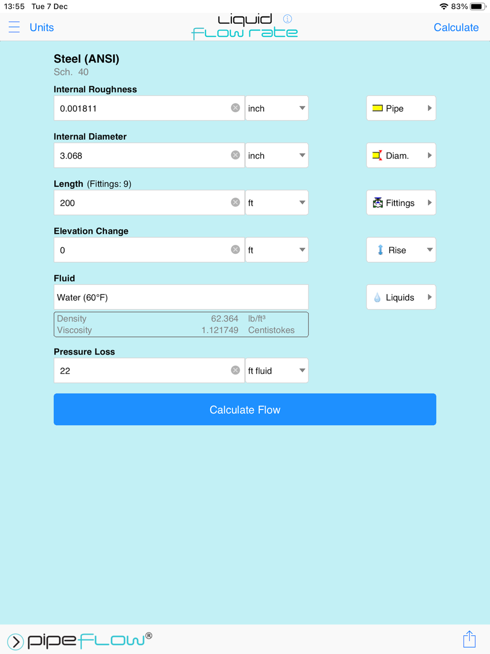 Pipe Flow Liquid Flow Rate is a flowrate calculator app from Pipe Flow Software that calculates the fluid flow rate in a pipe for a given pressure loss (includes friction losses and fitting losses). It uses the Darcy-Weisbach equation with Colebrook-White friction factors, together with K values for fittings, to provide accurate calculations.