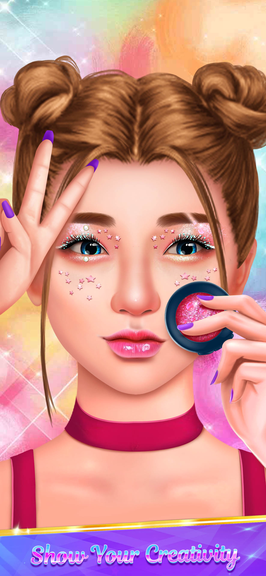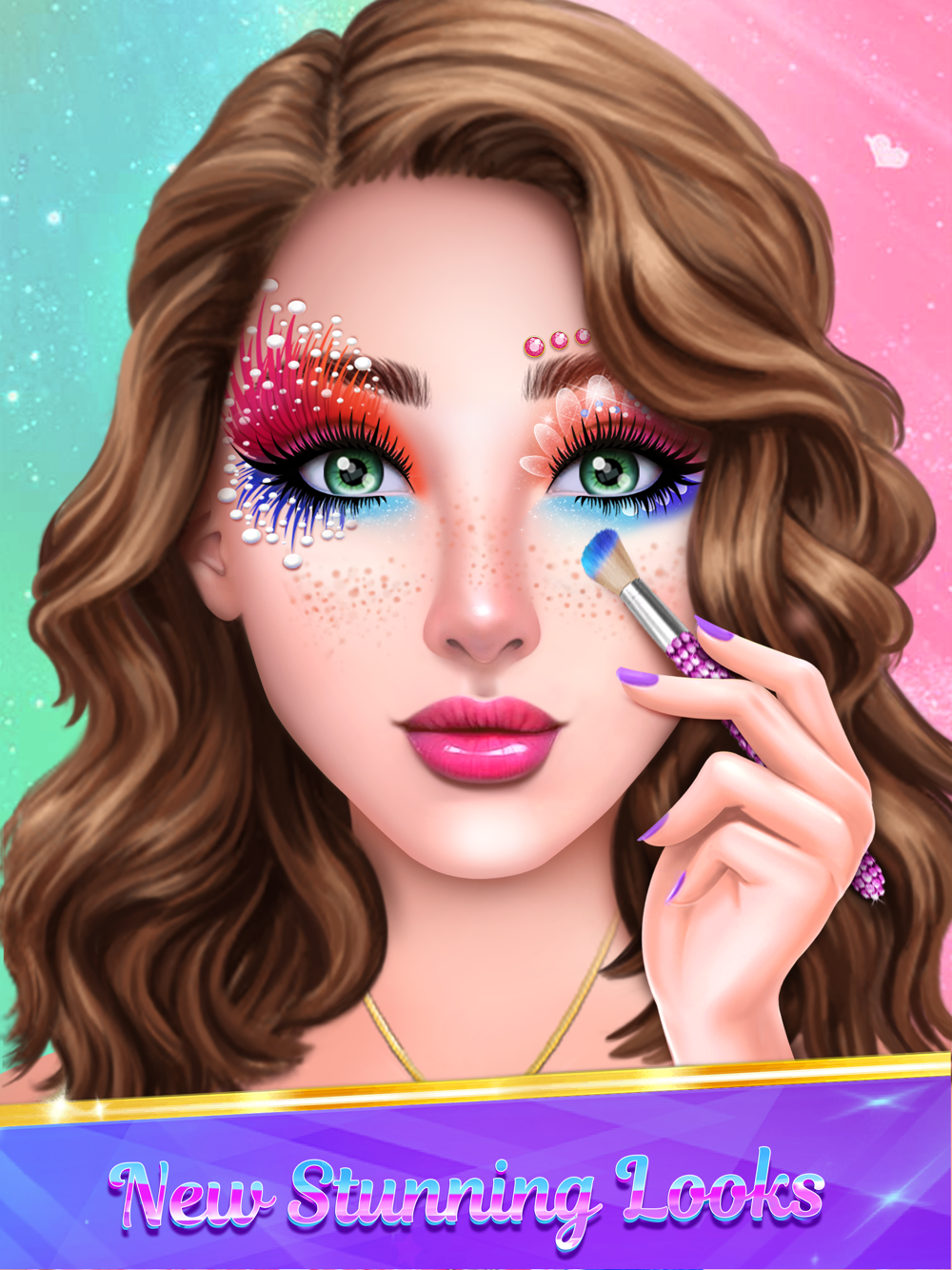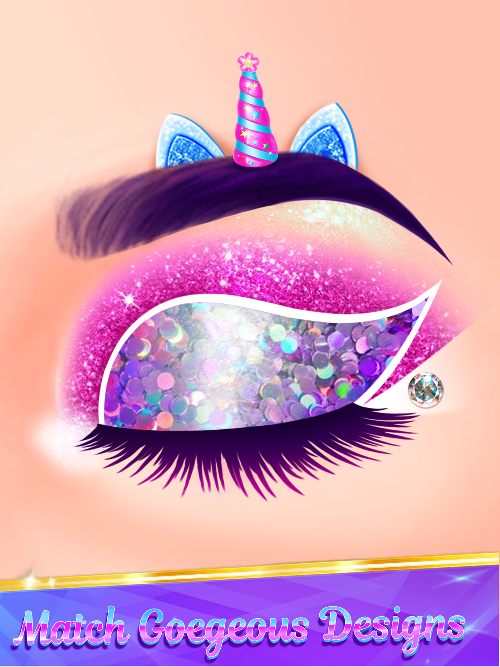 Apply gorgeous eye makeup in your eye parlor and paint your eyelashes and eyeshadow with unique and cool colors of eye makeup game. Select your eyeliners and draw some cute unicorn, butterflies, rainbow and so many cute stickers. Sparkly acrylic eye makeup colors and themes are waiting for you. Add some sparkling eye art with your own creativity in freestyle mode and play this makeup girl game.