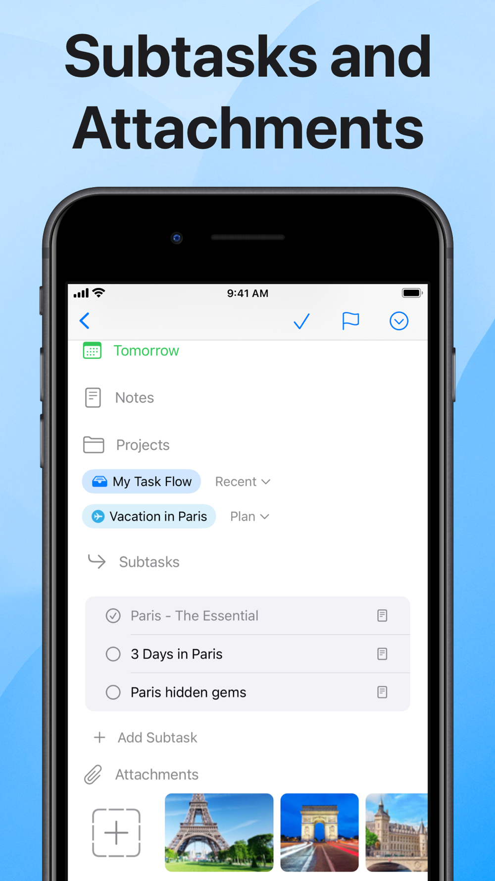 - Comprehensive Task Details: Enhance each task with subtasks, priorities, notes, and attachments for a detailed, organized approach. Highlight critical tasks within a project with elevated priorities.