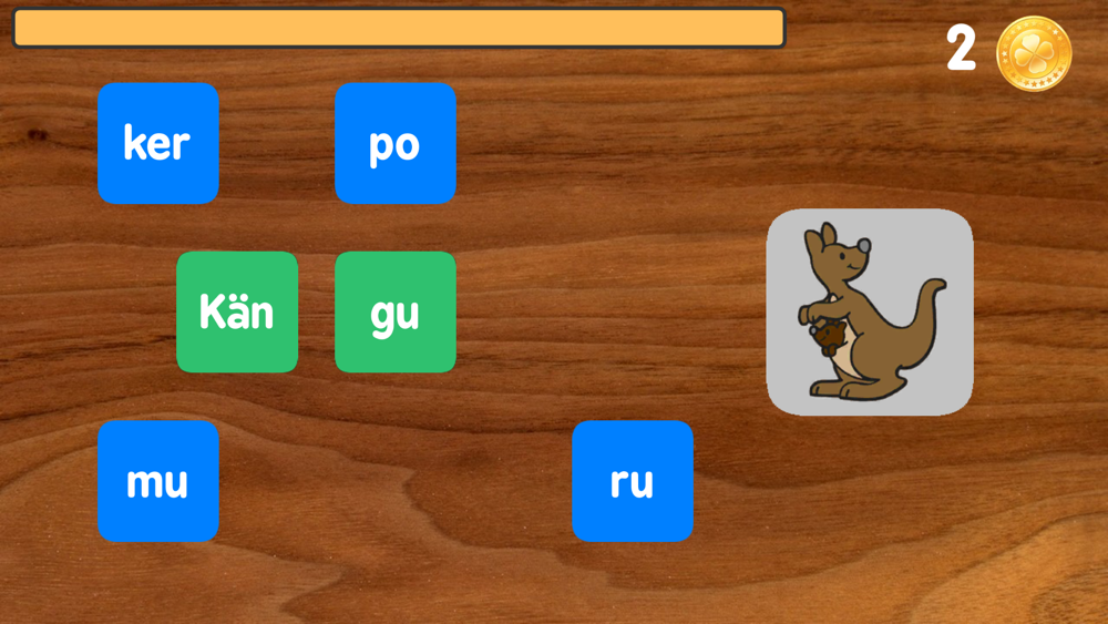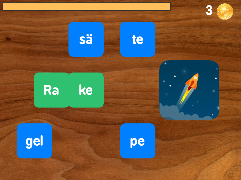 Ein Spiel, um leicht deutsche Silben zu lernen. Tippen Sie die richtigen Silben an, um das Wort zu bilden, das Ihnen vorgelegt wird! Wenn Sie ein Wort richtig gebildet haben, geht's mit einem neuen Wort weiter. Viele verschiedene Wörter zum Spielen und Lernen, die alle aus zwei oder drei Silben bestehen.