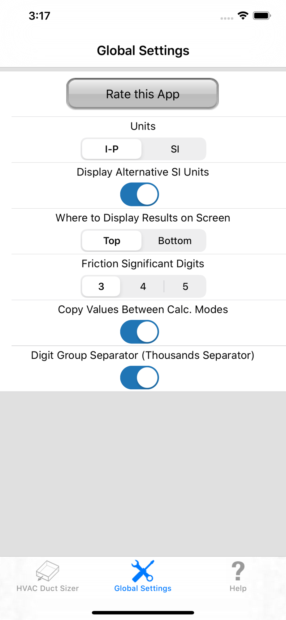 The HVAC Duct Sizer is a universal duct sizing app so that it works on both the iPhone and iPad and adjusts its screen size accordingly.