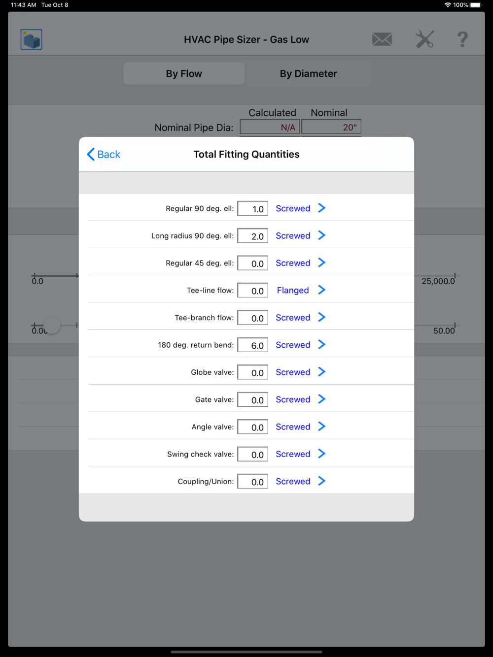 This application includes built-in pipe fitting equivalent length and nominal pipe sizing tables for a wide variety of pipe material types and diameters.
