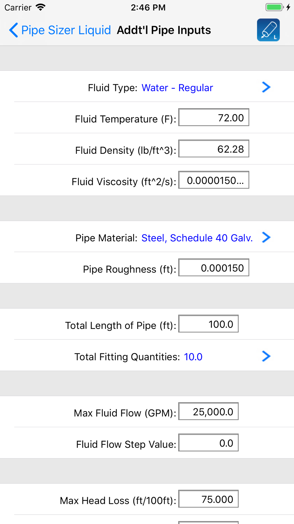 This application includes all of the great features of the individual pipe sizer apps such as the use of slider controls that allow you to quickly increment or decrement the input values and immediately observe the calculated results. It also allows you to specify different types of liquids, gases, pipe material types, fitting quantities, min and max ranges, and step values. Also, you can display a wide variety of English and Metric units.