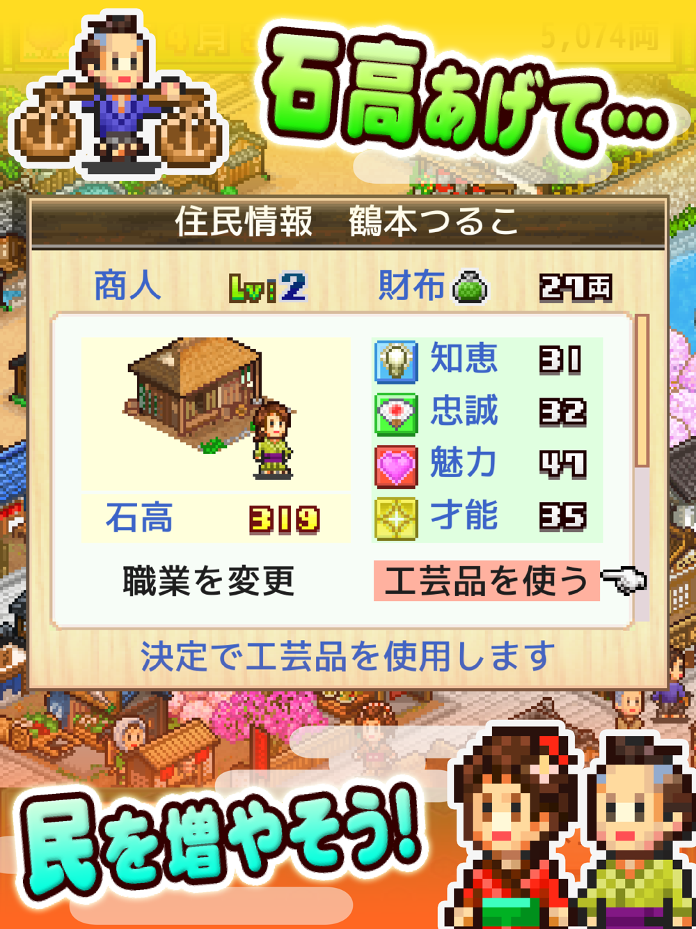 お城や住宅を自由に配置して、天下御免の城下町をつくりましょう。