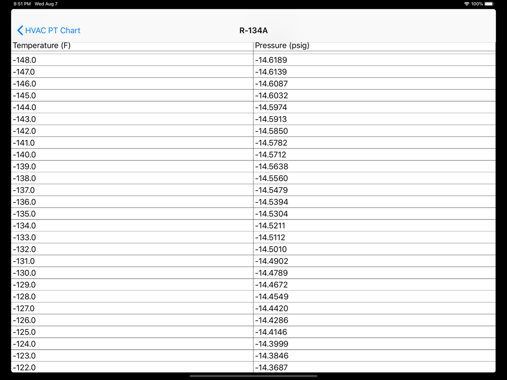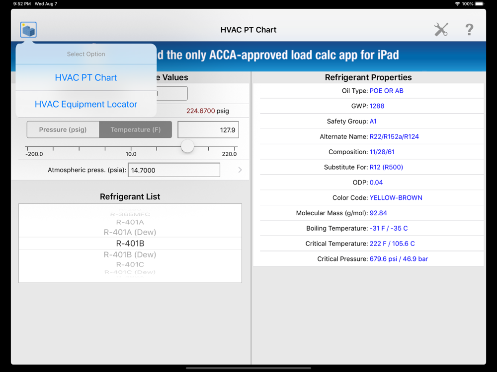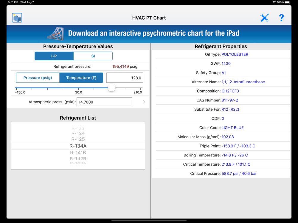 HVAC PT Chart is an electronic pressure temperature calculator that allows HVAC technicians and contractors to quickly look up the temperature and corresponding pressure for 100+ common HVAC refrigerants including both bubble and dew versions of azeotropic (mixture) refrigerants. This is the only PT Chart app that allows you to email complete PT chart lists, refrigerant properties, and your inputted values/results.