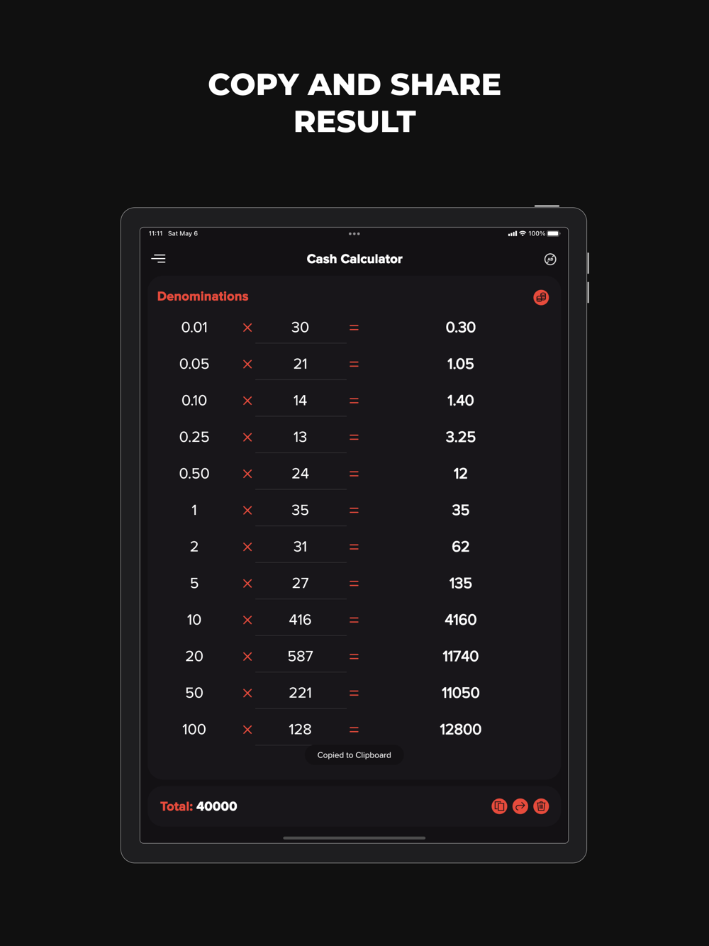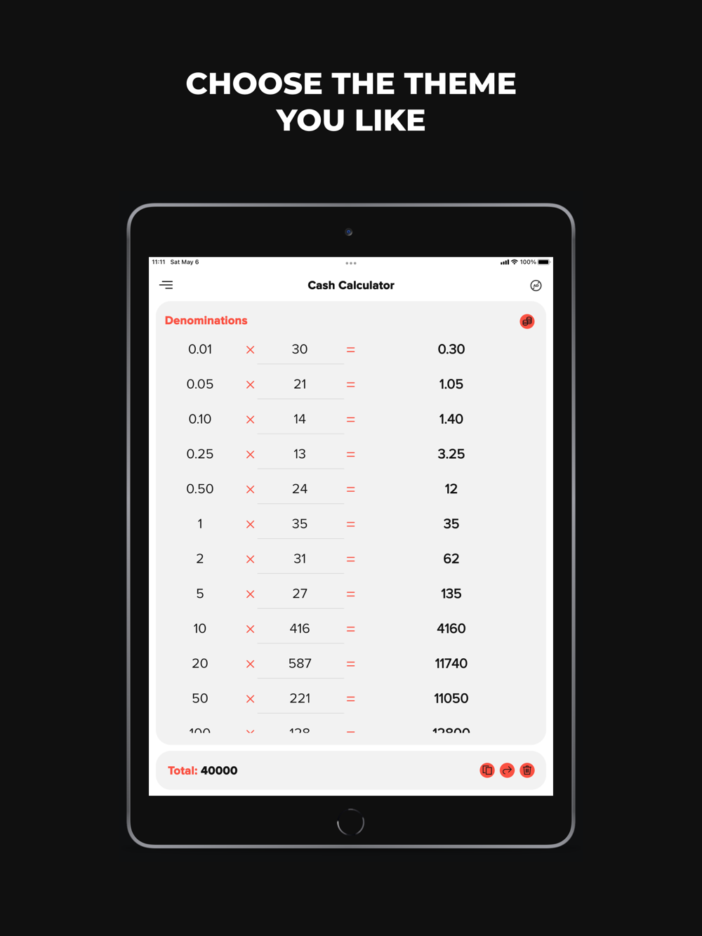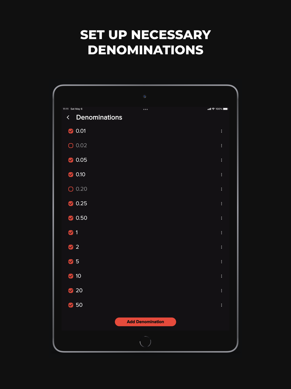 Perfect for every individual and business, this tool that adapts to all countries and currencies, making it a truly global Cash Counting App. Plus, its flexible denominations setting offers customized counts based on your specific needs.