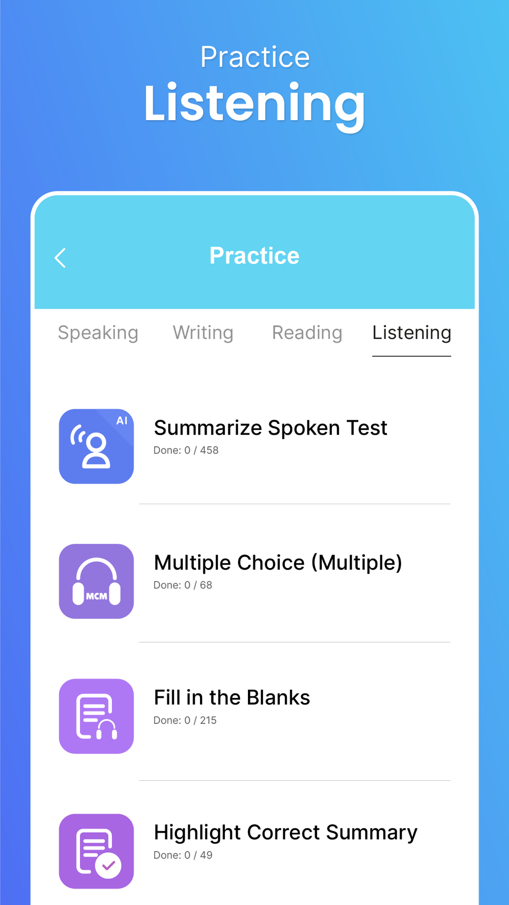 Take your listening practice from the Summarize spoken test, Multiple/single answer, Fill in the blanks, Highlight correct summary, Select the missing word, Highlight incorrect words, and Write from dictation. This feature will be added very soon.