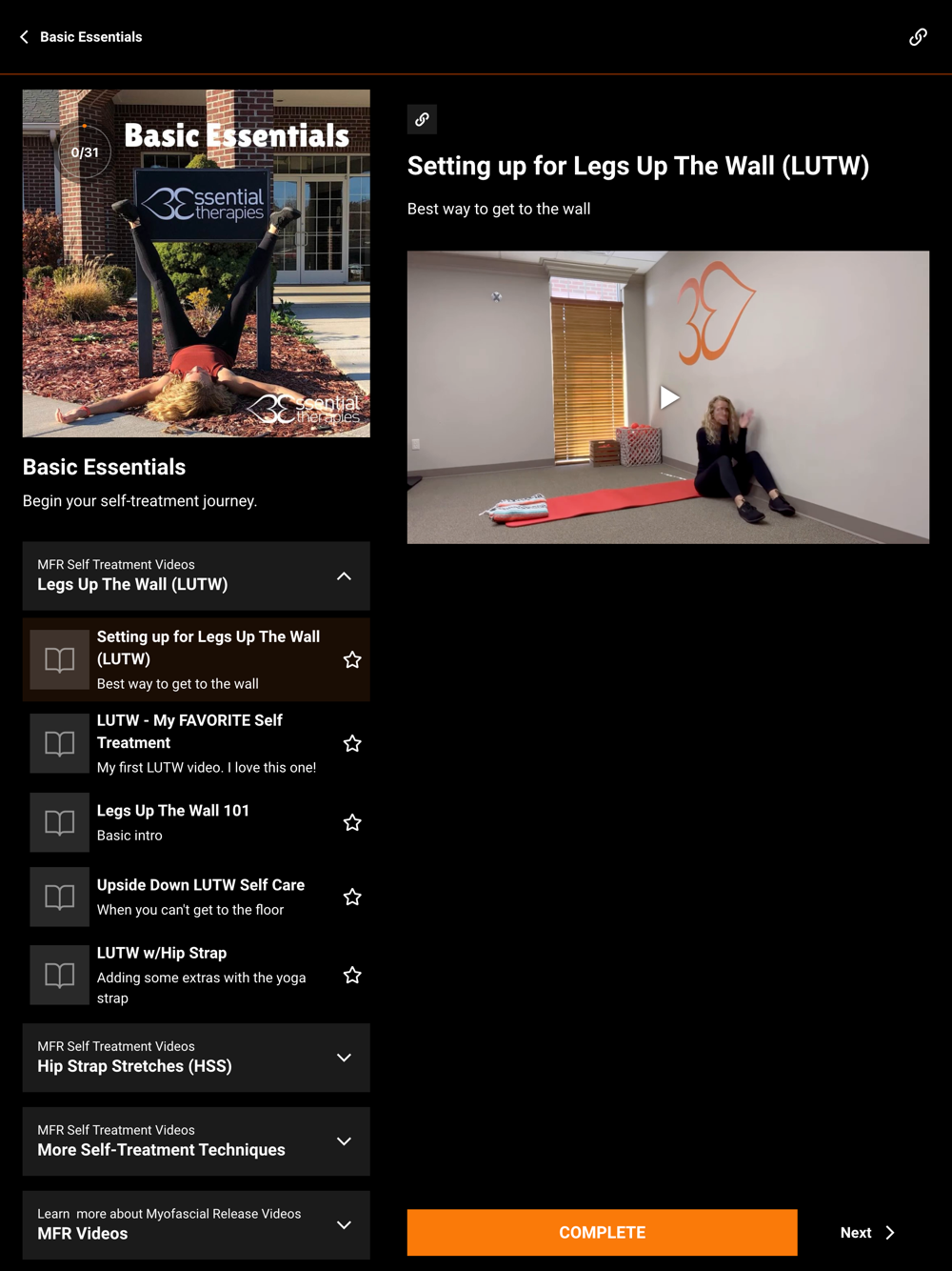The Essential Therapies app helps you take your healing to the next level with guided myofascial self-treatment, stress relief tools, and techniques to improve awareness, mobility, and pain-free function—right from your own home.
