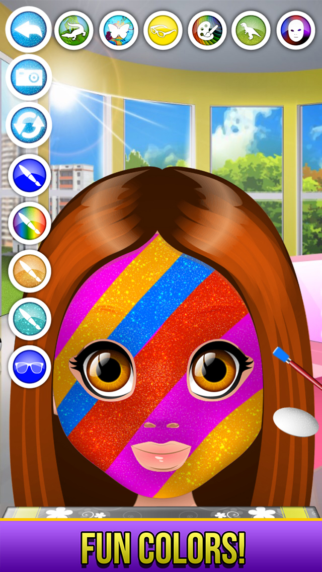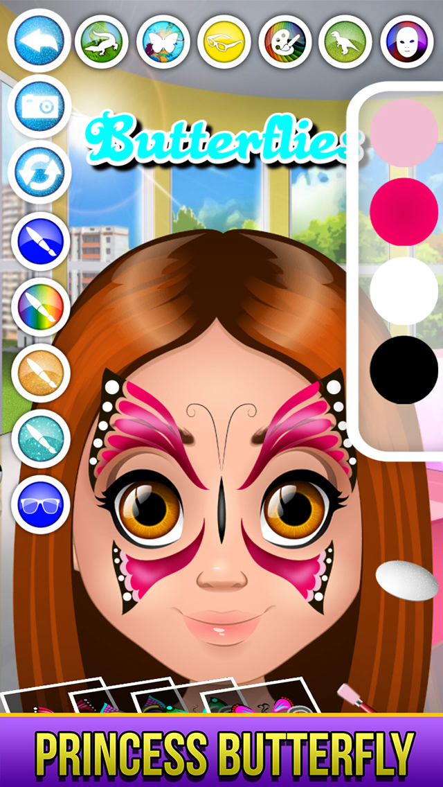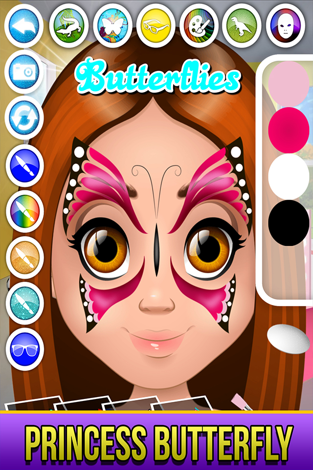 Use the eraser to remove face paint or reset. Save your best designs! Have fun!