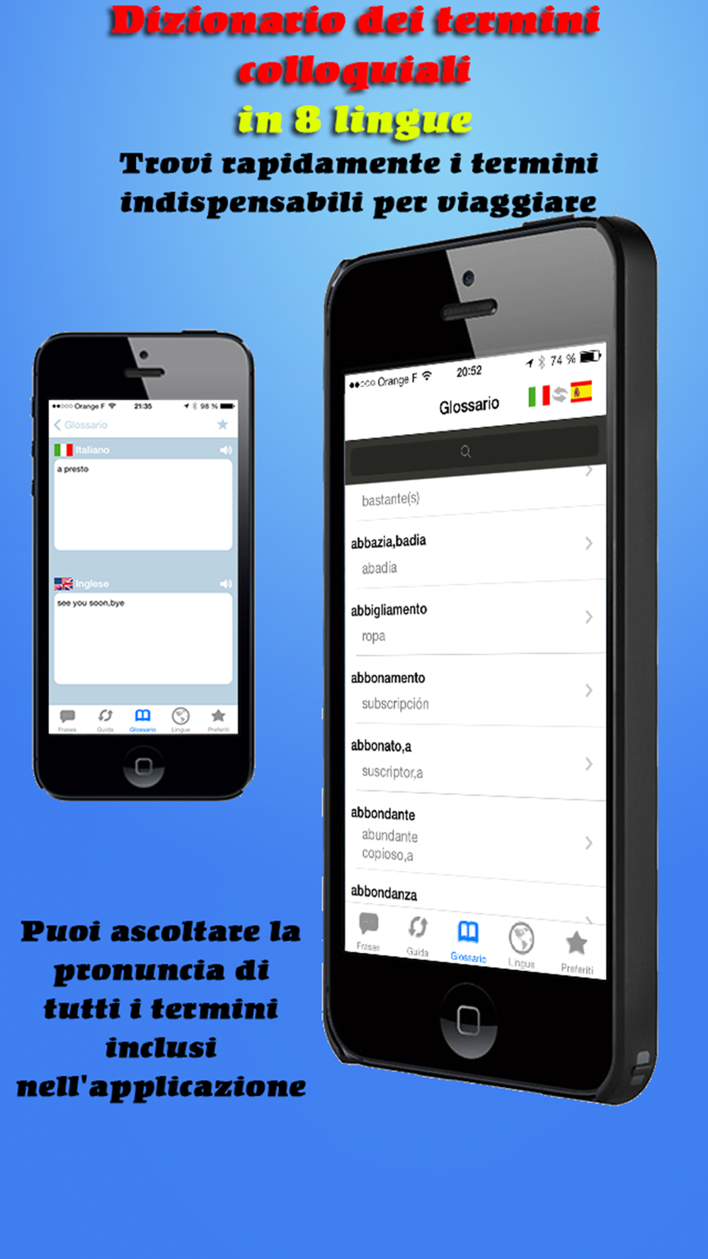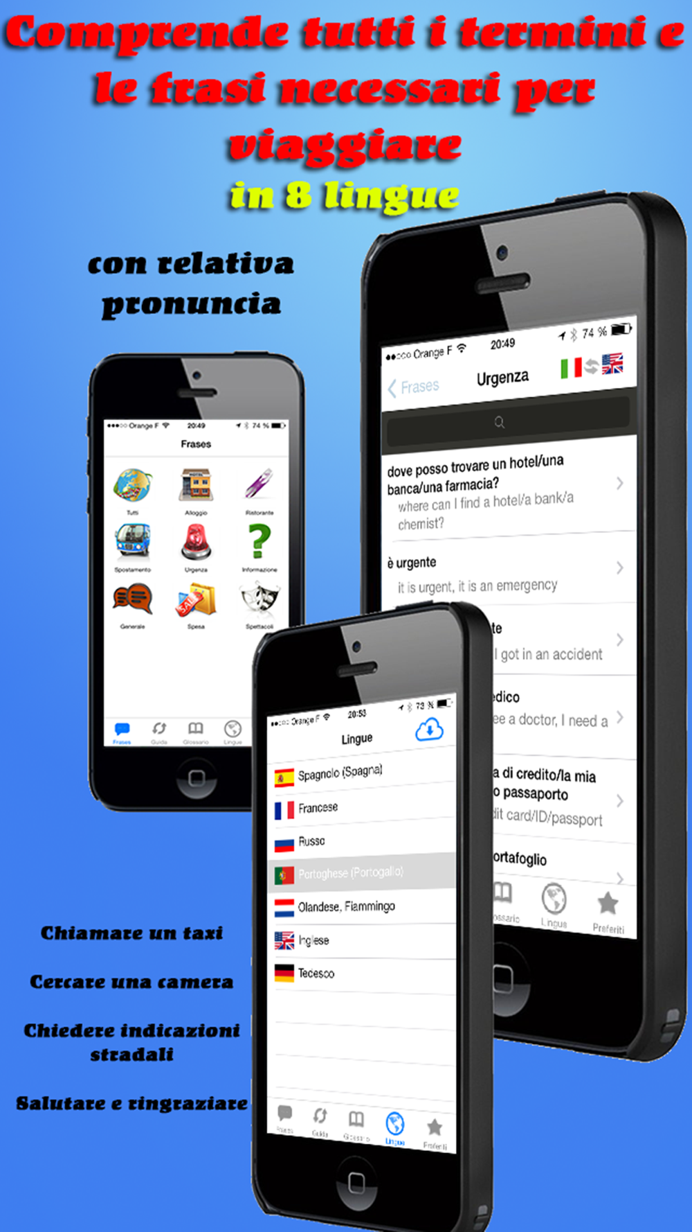 Dire buongiorno, cercare una camera, ottenere indicazioni stradali, domandare aiuto, cercare un ristorante, chiedere informazioni per una visita, ringraziare, porre domande pratiche... Troverai in questa applicazione tutte le formule indispensabili per comunicare quando sei all'estero, tradotte da traduttori professionisti. Più rapido di un traduttore automatico, il suo modulo di ricerca ti permette di trovare la frase adatta a ogni situazione a partire da una sola parola.