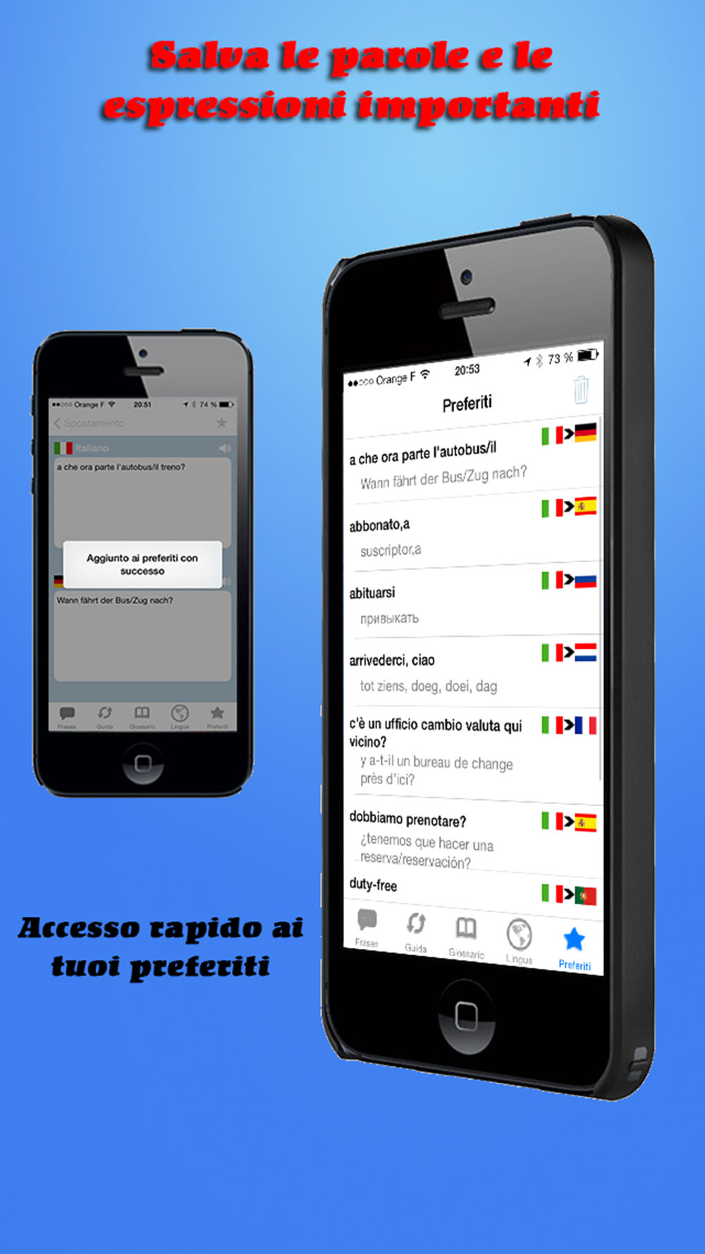 Cliccando su ogni frase o parola potrai ascoltarne la pronuncia. Quando hai davanti un interlocutore, puoi fargli ascoltare la parola o la frase che ti servono, oppure ripetergliela. Puoi salvare le espressioni che usi più spesso tra i tuoi preferiti, così da accedervi più velocemente.
