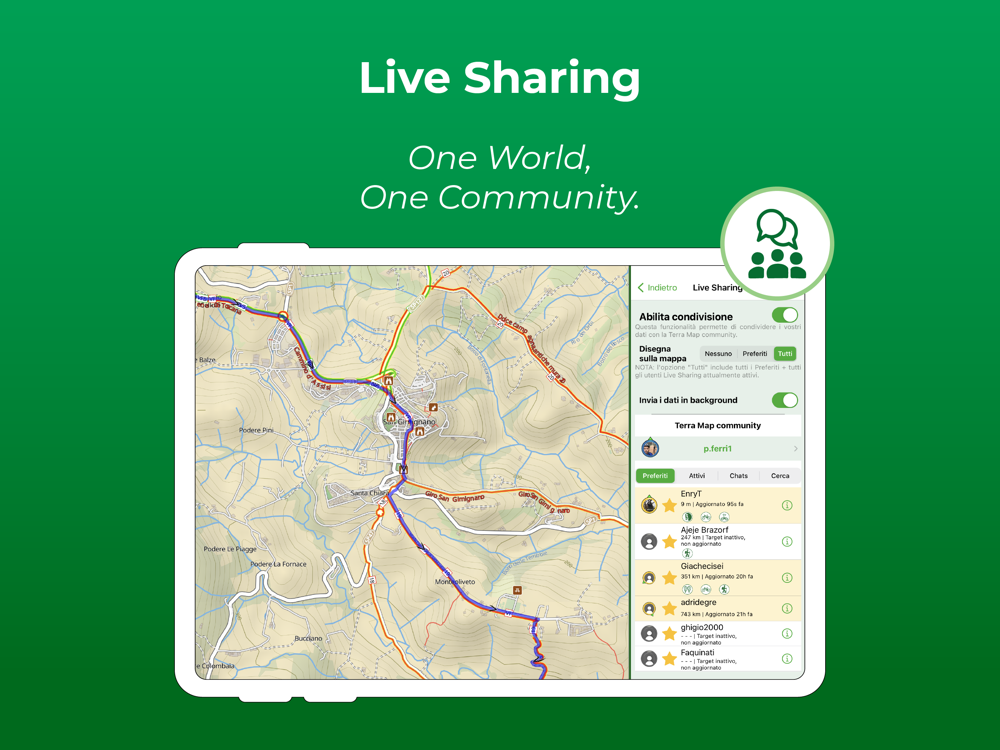 Enable Live Sharing to share your data with the Terra Map community and see all active users around you. You can chat with them and send (and receive) your markers/tracks without leaving the app.