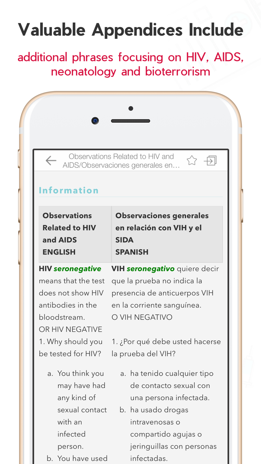 - Valuable Appendices include additional phrases focusing on HIV, AIDS, neonatology and bioterrorism
