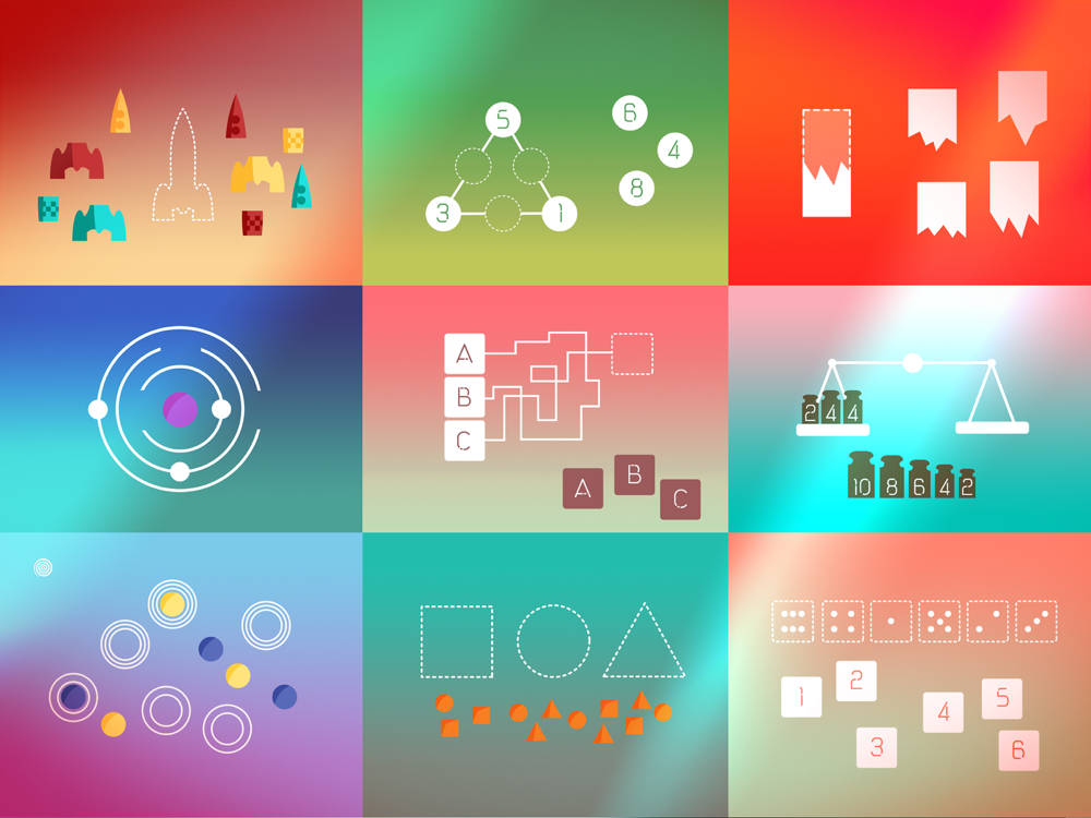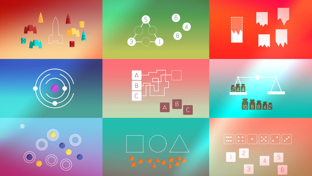 Clasificar objetos, completar dominós, equilibrar una báscula, identificar figuras y colores, encontrar una continuación lógica...
