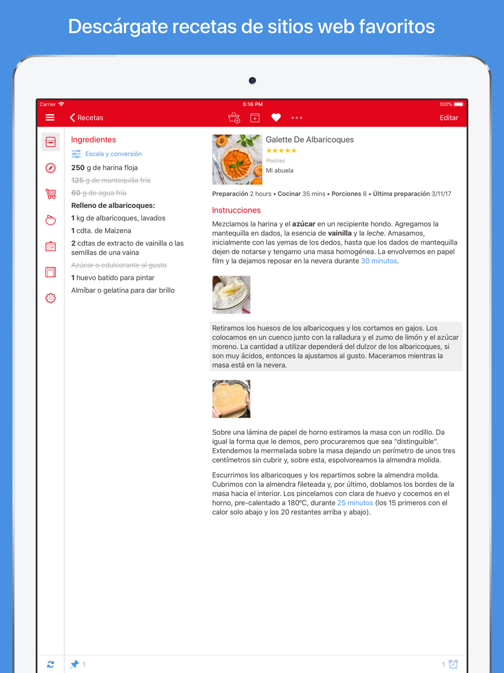 • Añade varias fotos de tamaño completo a cada receta. Incrusta fotos en tus instrucciones.