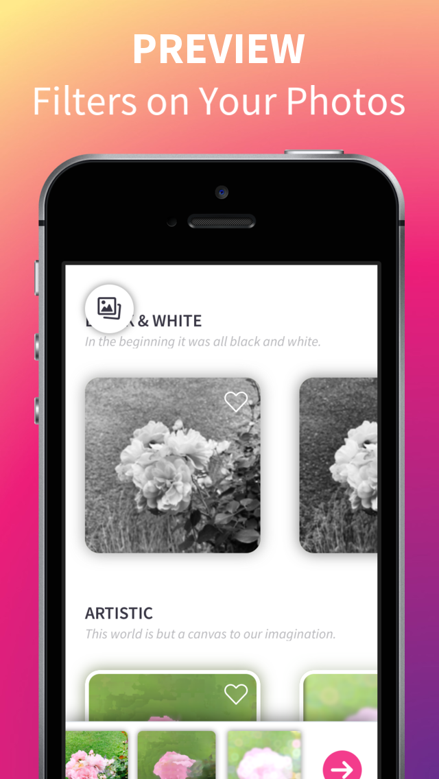 Apply **BEAUTIFUL PHOTO FILTERS AND EFFECTS** with JUST TWO taps to any photo of your choice!