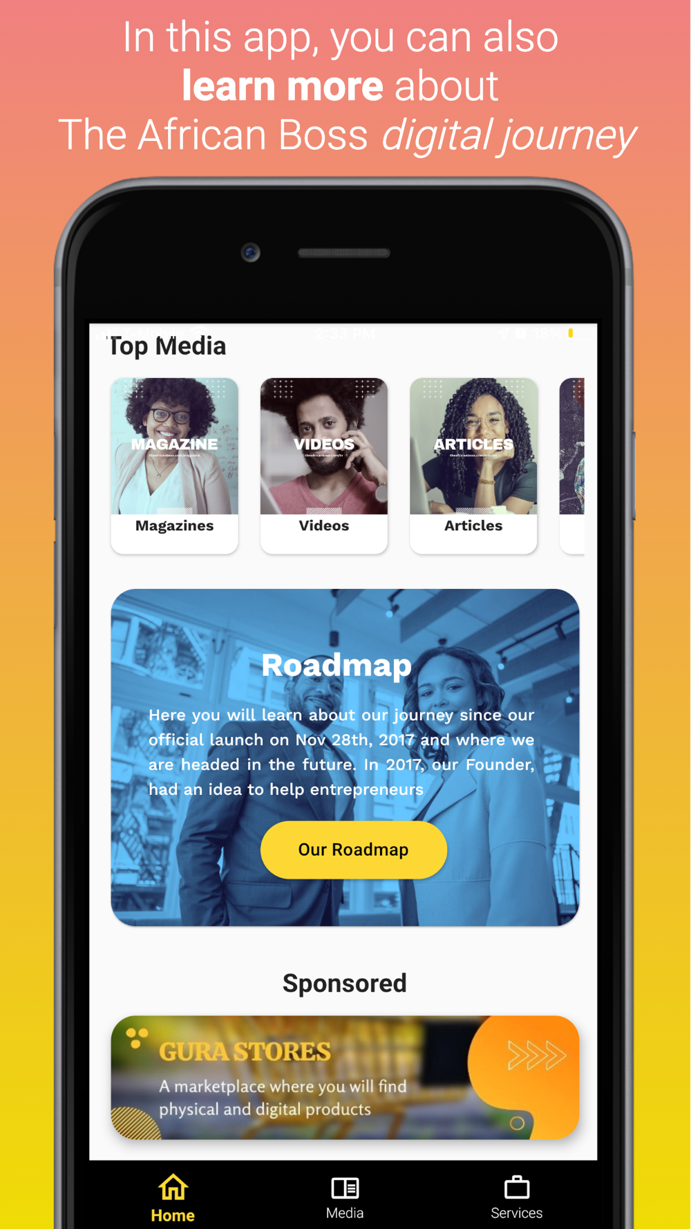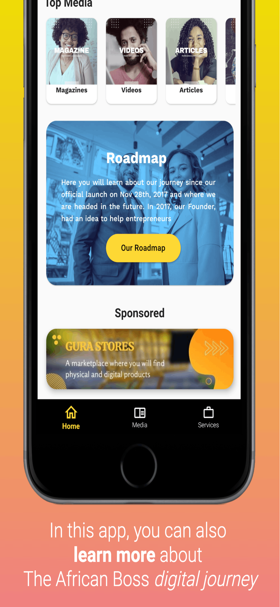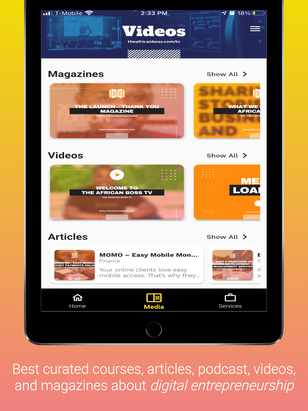 The African Boss App shares magazines, articles, podcasts, and videos from The African Boss.